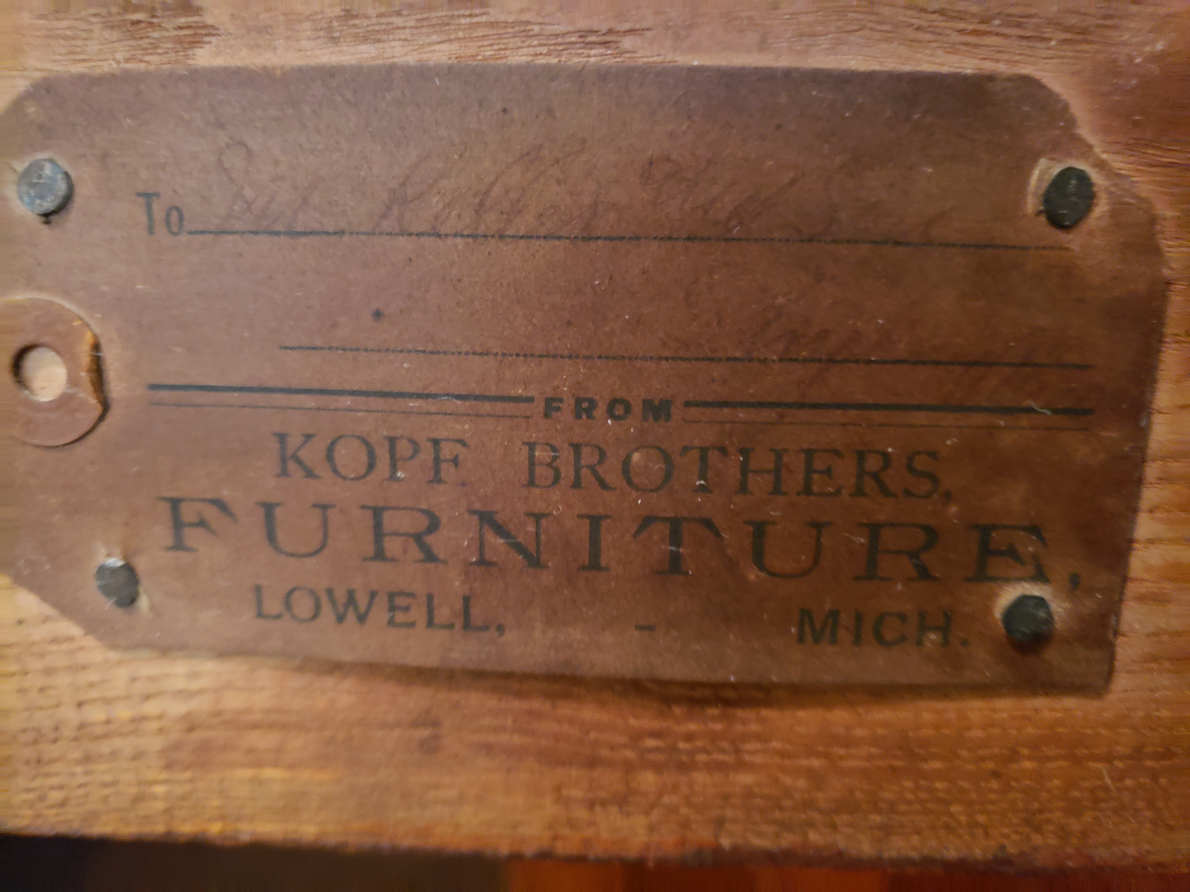 I inherited a 3 drawer dresser with attached upper frame with adjustable mirror that appears to be old, but I can't find any information about it online.  It has a tag nailed to the upper part of the back of the mirror that says Kopf Brothers Furniture Lowell Mich.  It appears to have all original hardware and ceramic wheels. It is in great condition with the exception of the dresser top, just needs a good cleaning. See pictures.