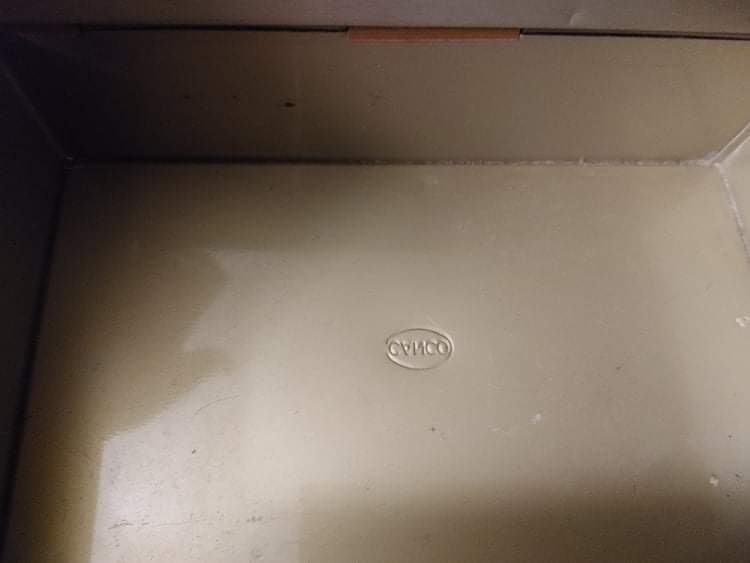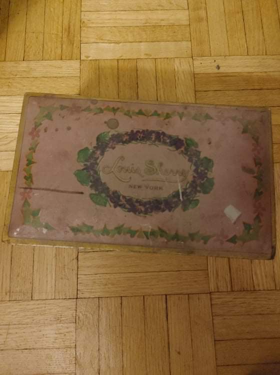 Metal tin with “Louis Sherry, New York” on the top. It originally held the 24 set of chocolates. Outside of lid needs cleaning due to dust build up…don’t want to try! Slight scuff on lid as well, but repairable. The rest of the tin is in remarkable condition, colours so vibrant. I’m thinking it’s from the ‘30s or ‘50s. Lid is double layered to keep chocolates fresh.