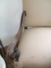 The upholstery is green and cream with a velvety feel on the green part. The fabric is worn out a bit at the front of the seat cushion.