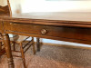 Six drawer solid wood office desk with one pull out on left side and one pull out on right side. Upper left hand drawer is actually two drawers in one and can hold legal size (8.5" x 14") files. The center drawer locks and the key is included. Desk measures 30" deep x 60" wide x 29" tall. Desk was built by JOFCO(now JSI Furniture) out of Jasper, IN. Handles are all original.