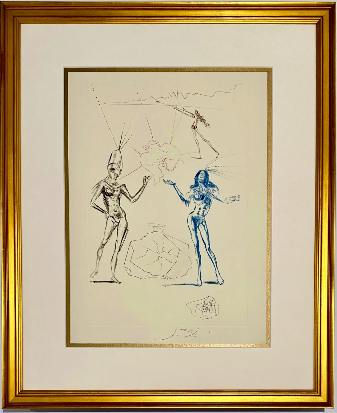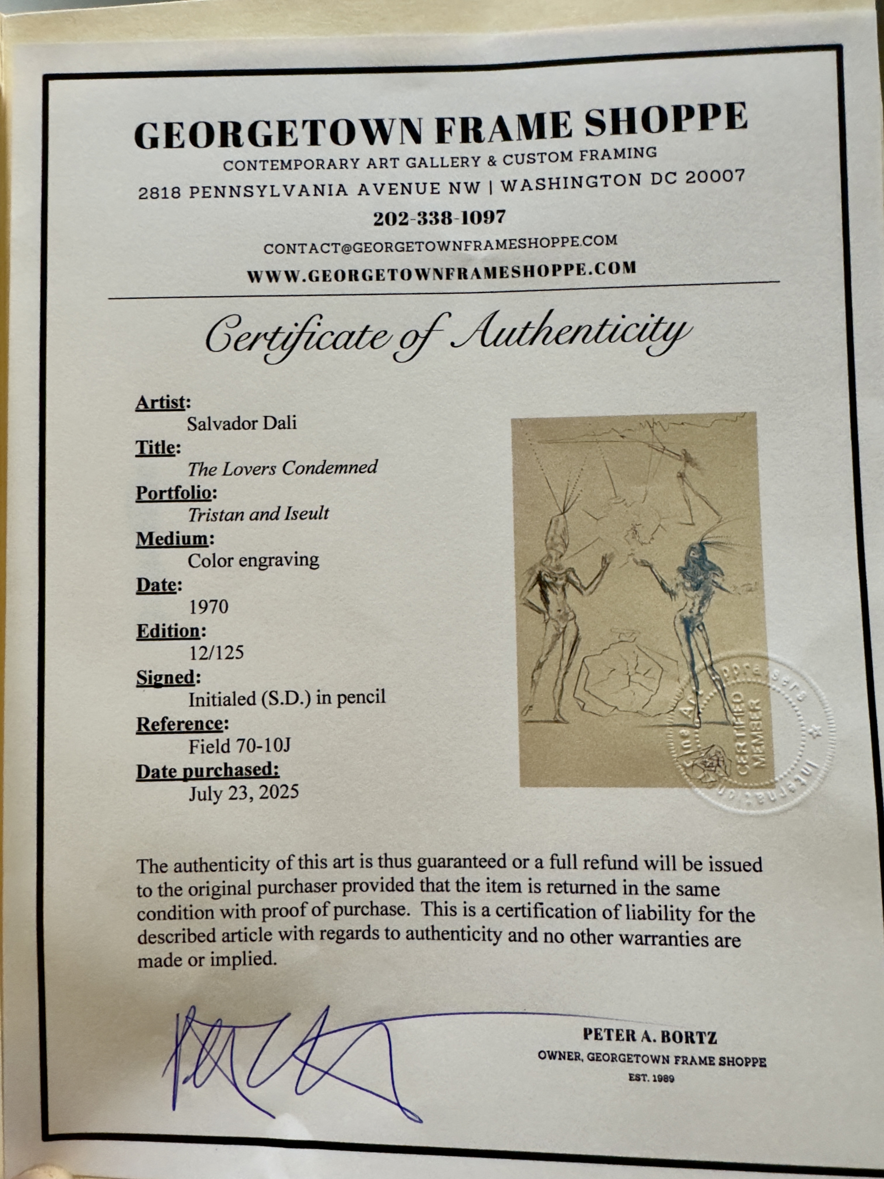 The etching is hand-signed by Dalí and comes with certificates of authenticity from both the Salvador Dalí Gallery and Georgetown Frame Shoppe, confirming its legitimacy.