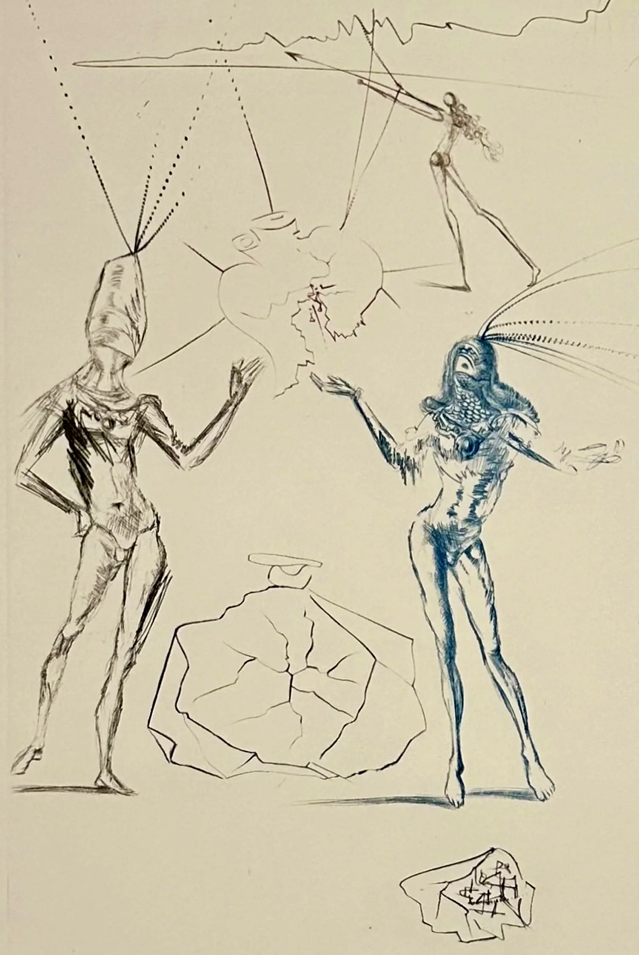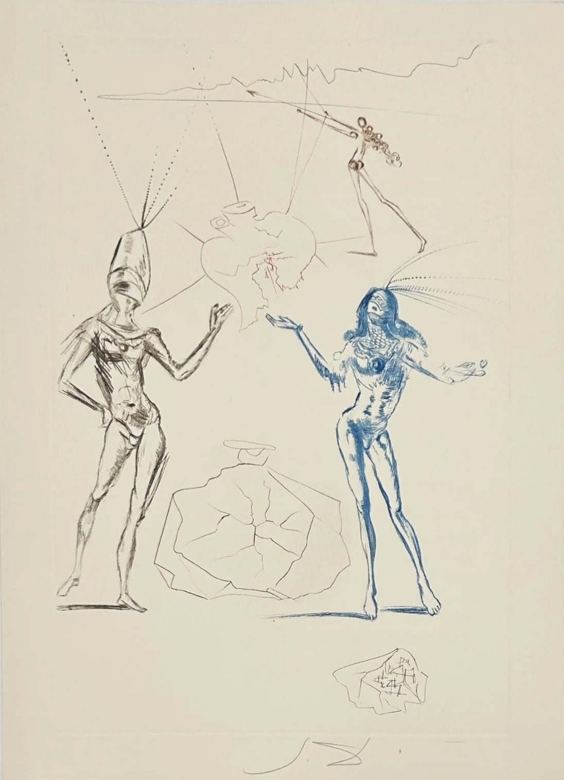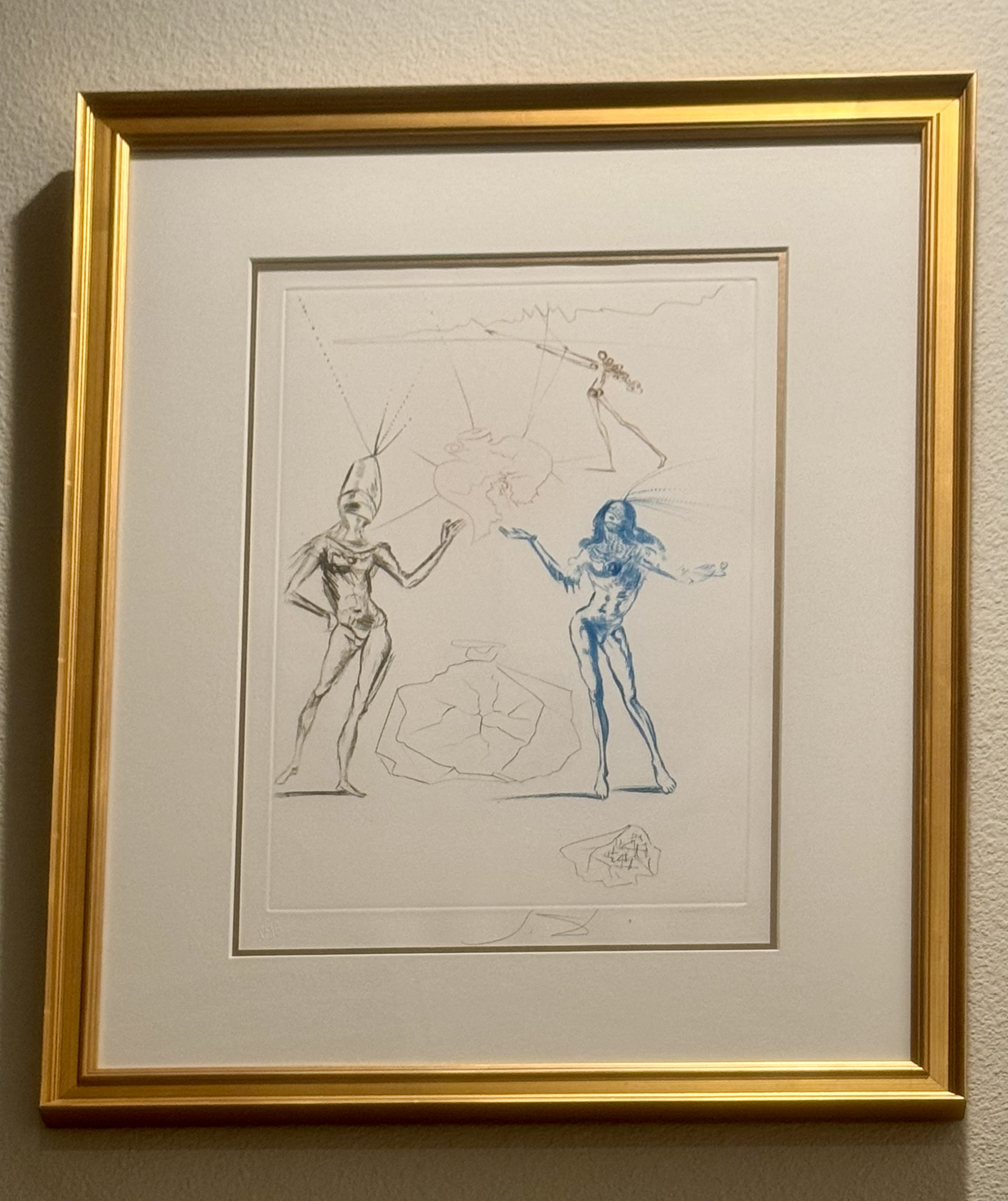 The Lovers Condemned. Made by Salvador Dalí. Dating to 1970. Materials: Color engraving. Estimated value: $12,000 – $15,000. Condition: Mint. The market for Salvador Dalí's works remains strong, with original etchings and prints often fetching high prices. Current trends indicate a rising interest in surrealist art, particularly pieces that are well-documented and authenticated.