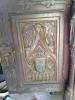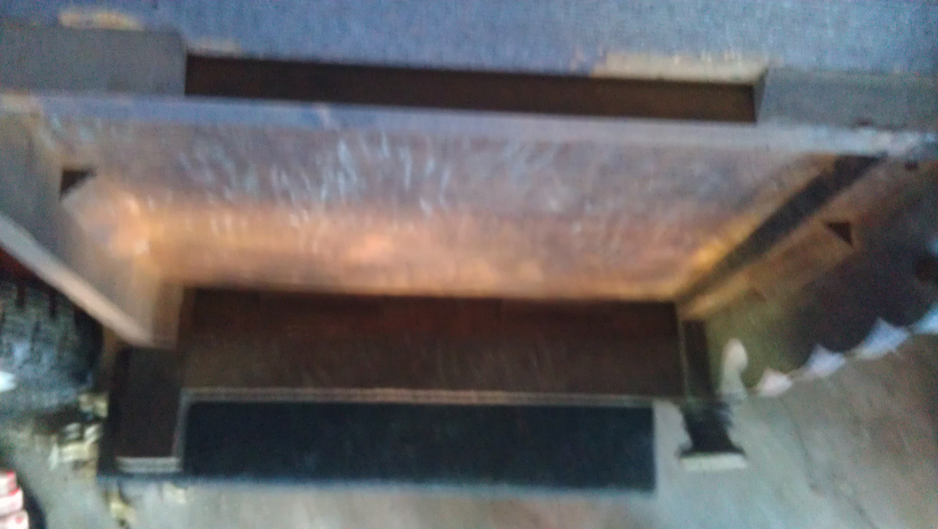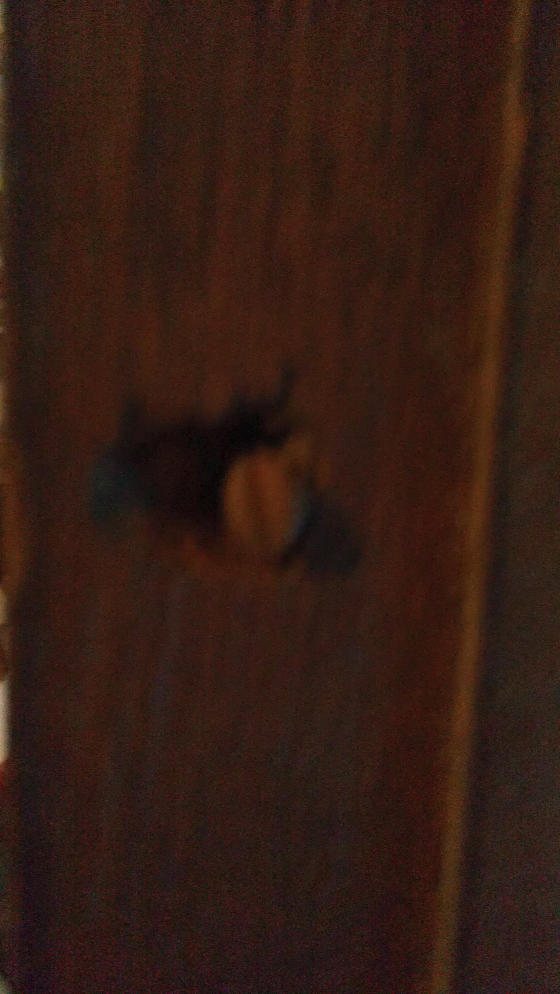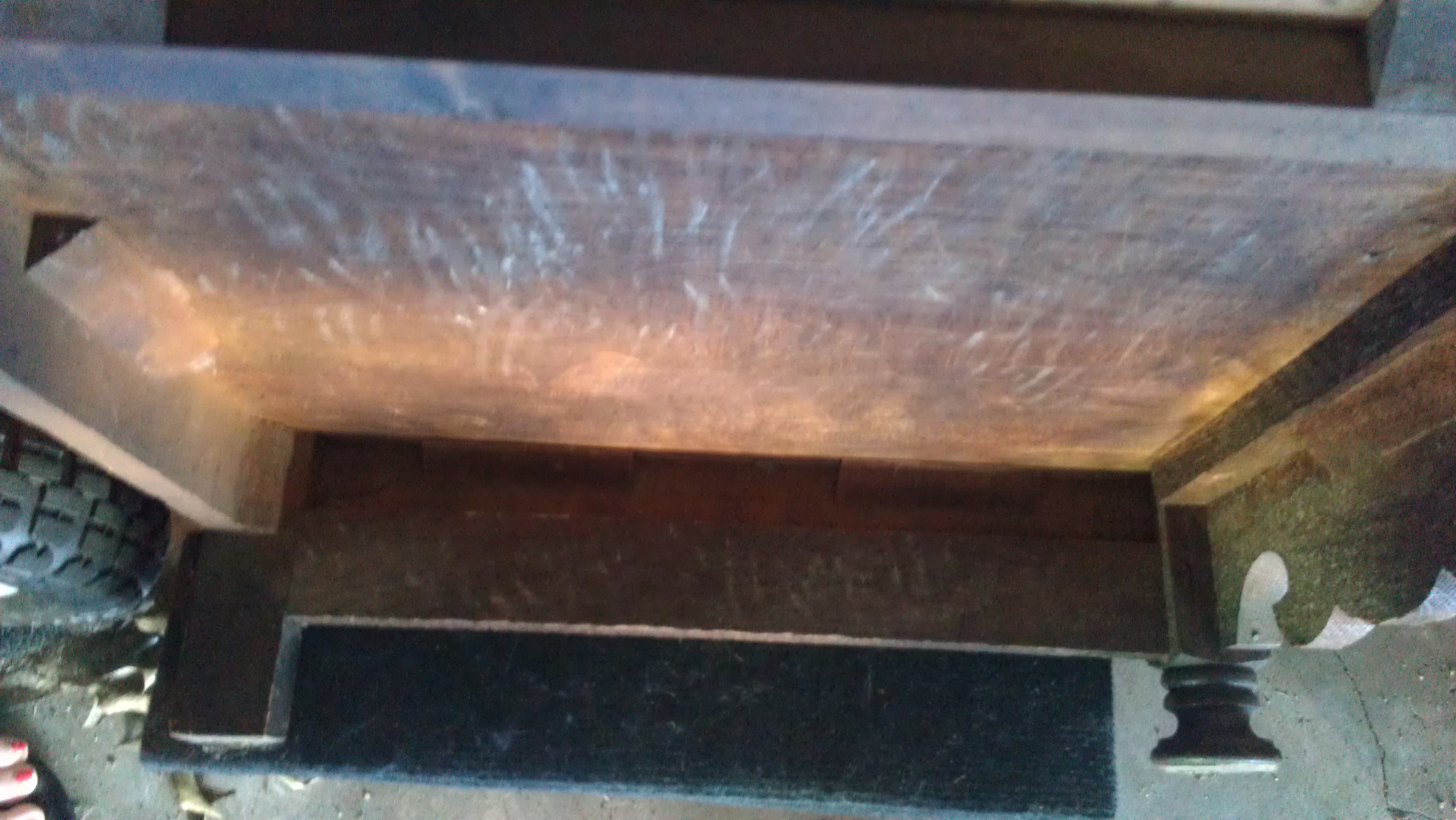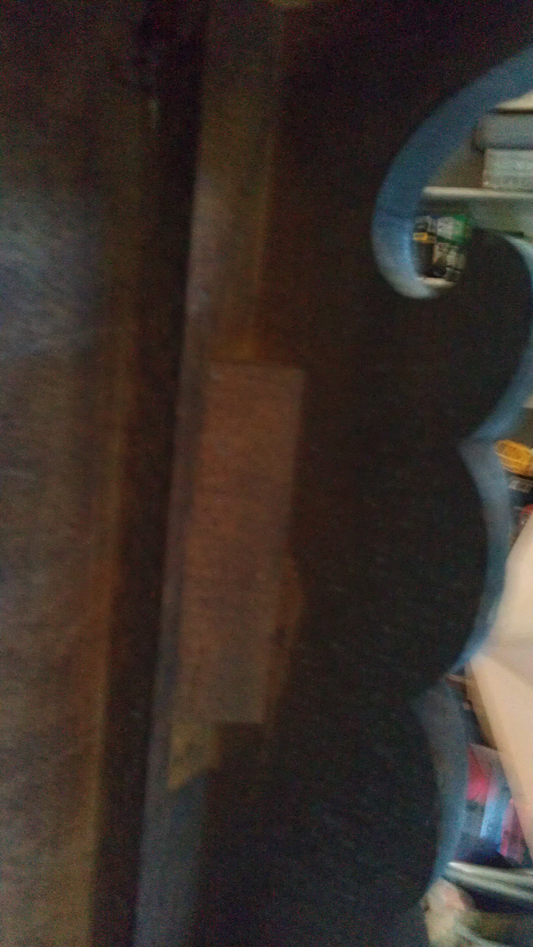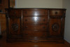 Low profile buffet sideboard with door on each front end, with draws in the middle. Detailed design / carved pattern on doors and draws. Side doors have flower carved reminiscent of a fleur de lis, but not a fleur de lis. The flowers have 5 fronts at top and 3 each on each side, with the sides facing upward. Dimensions are 26" high, 60" wide and 20" front to back . About 2 foot x 5 foot x 20". Construction is solid wood, which could be walnut, but not sure. Mostly joins, but there are some very small nails on the underside - only a few that are visible. The only screws visible are those that attach the backboard on top of the buffet surface. Photos on Craigslist at htp://www.oklahomacity.craigslist.org/atq/5041946844.html