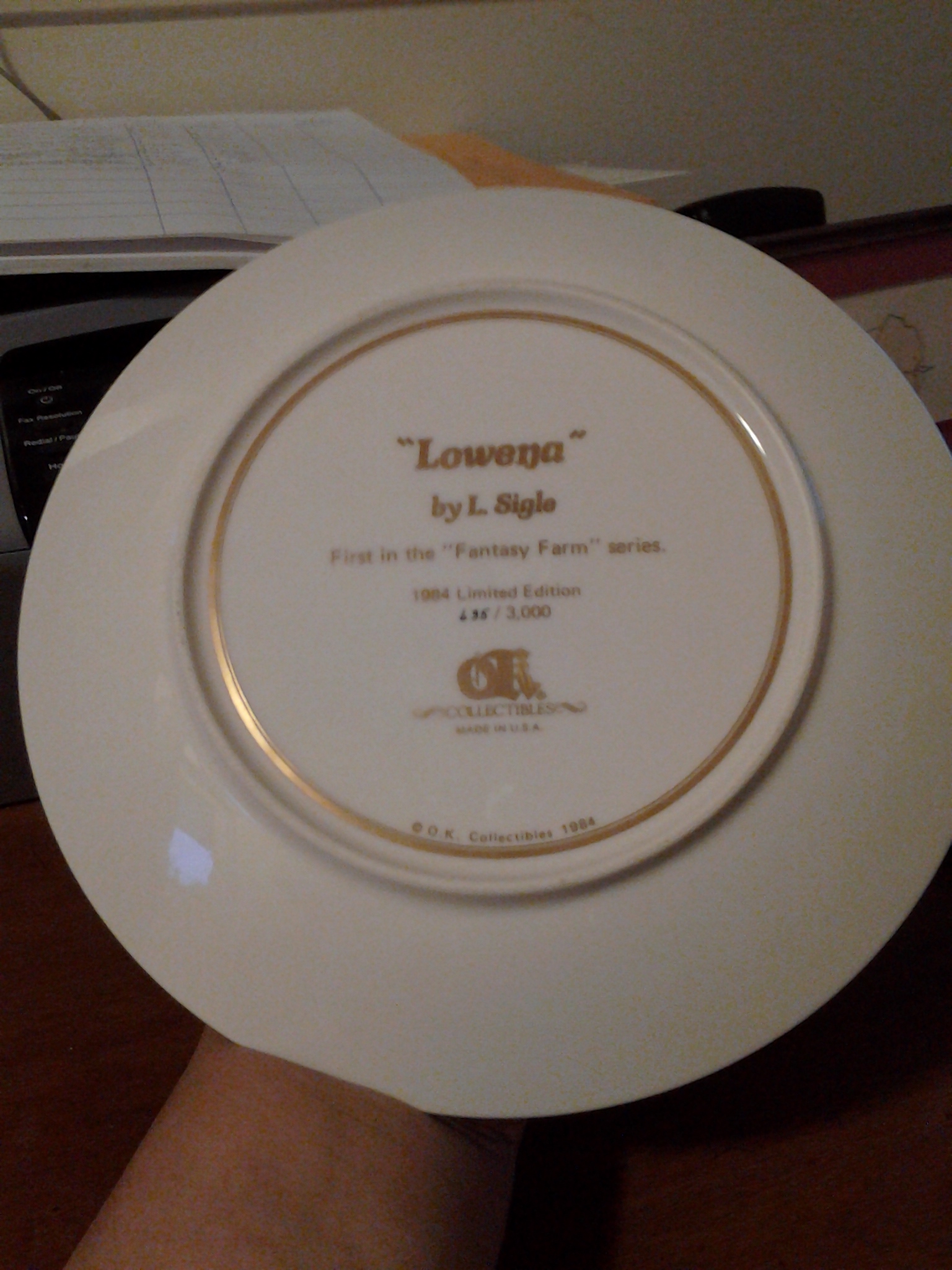 "Lowena" is the first in the "Fantasy Farm" series and was made by Louise Sigle. It was made in 1984 and is a limited edition with only 3000 of these collectors plates made. It's put out by O.K. Collections and this particular plate is #635 of 3000.
