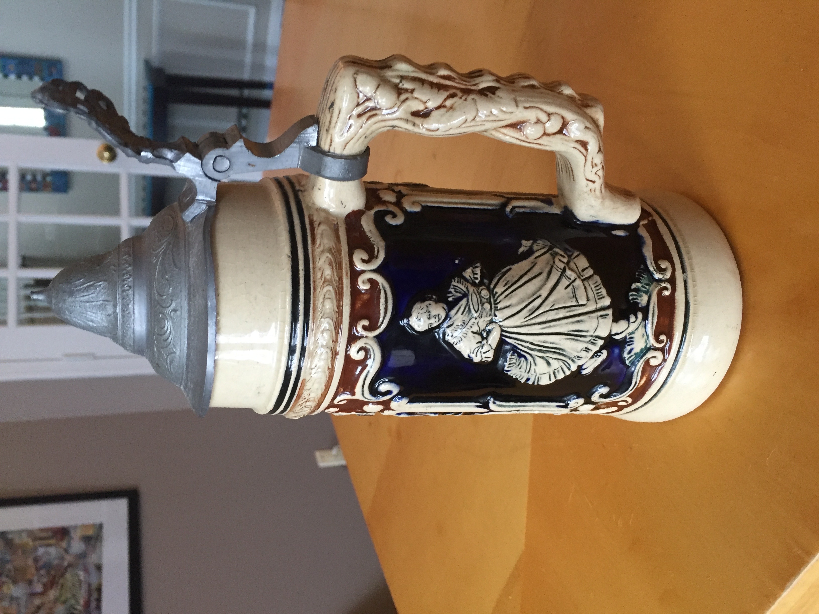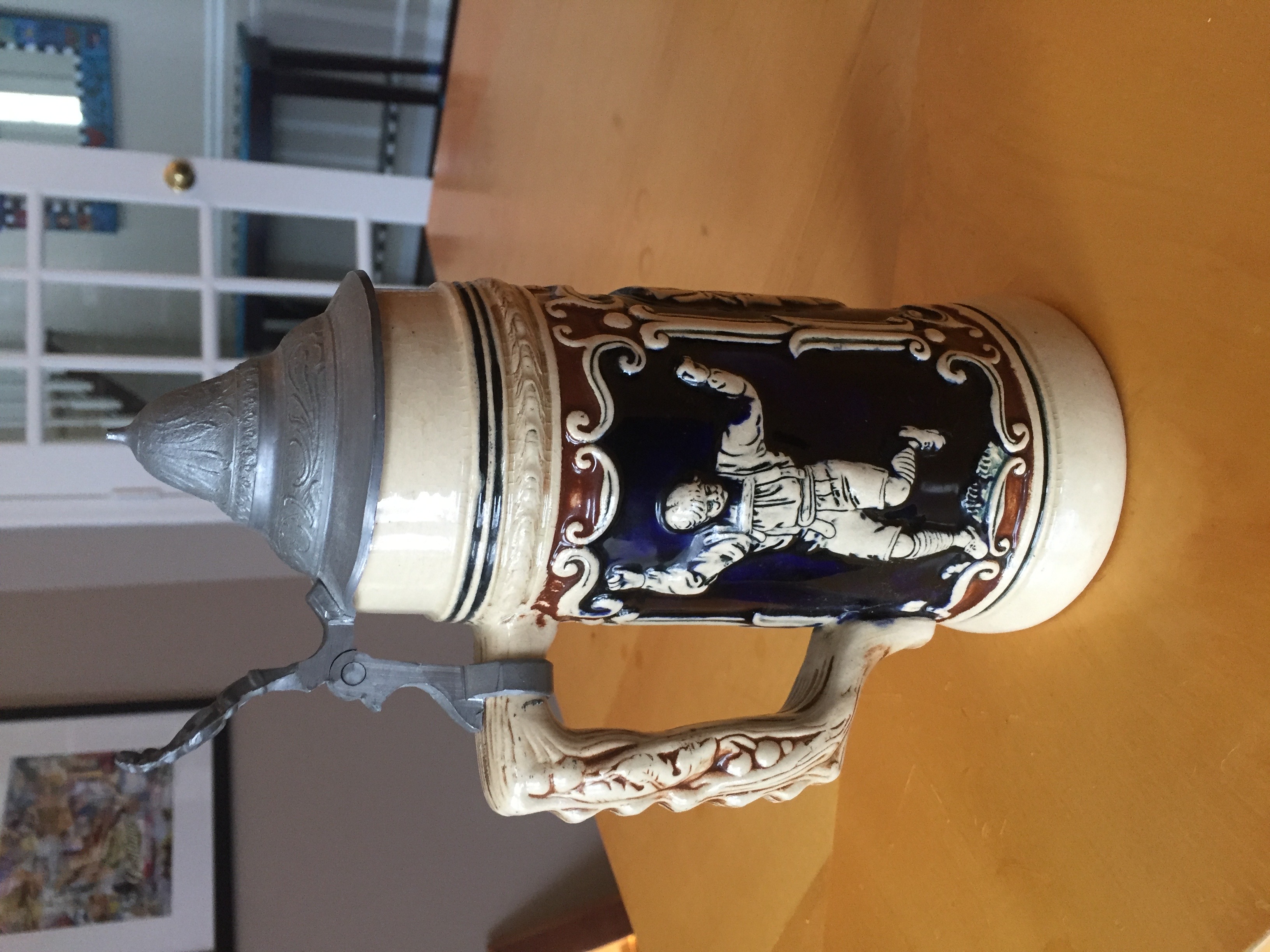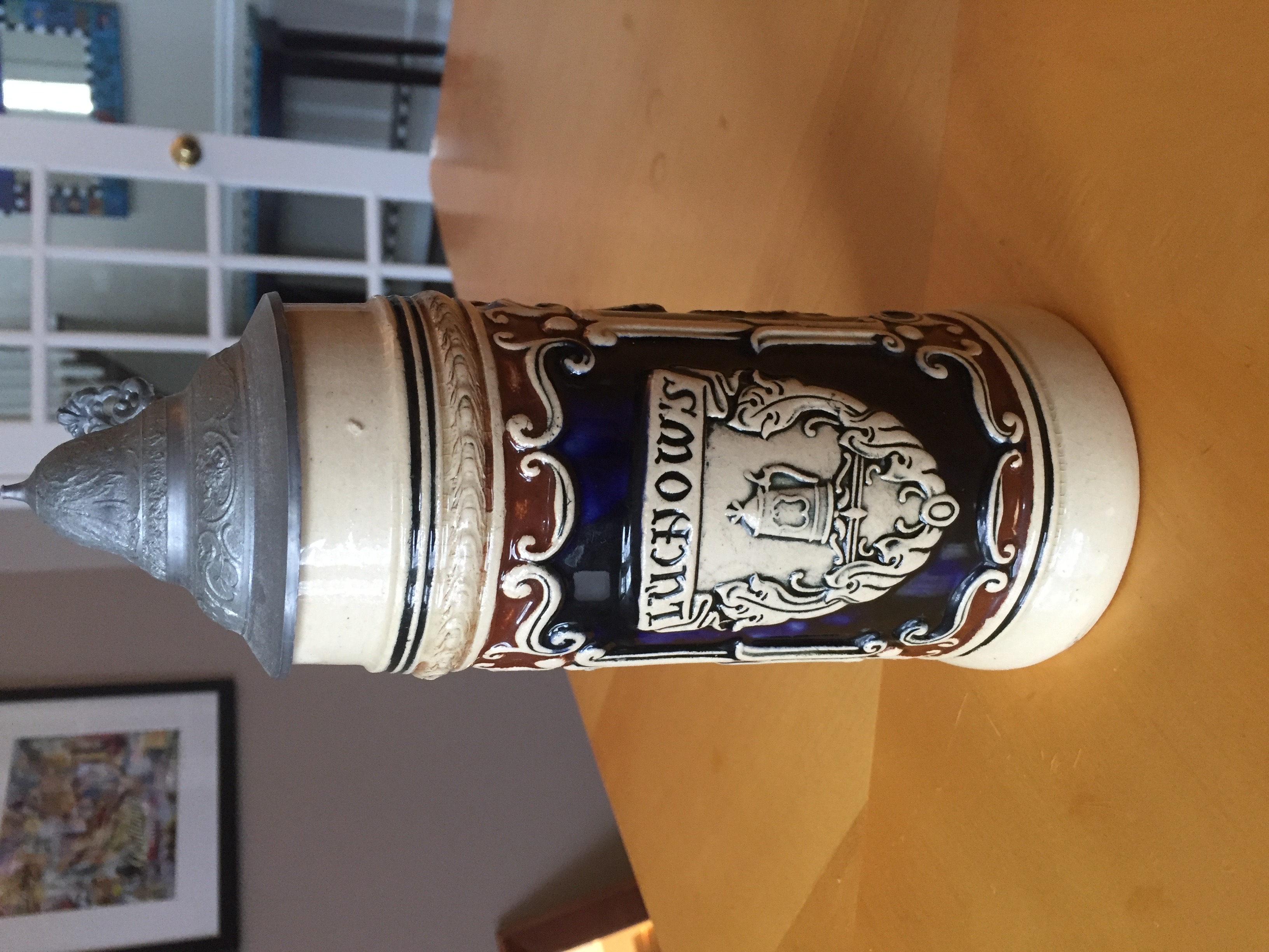 Two items from Luchow’s in NYC. They belonged to my grandparents. First item is a beer stein with a pewter lid. The bottom is stamped with “GERMANY” and the number 9 (or 6) and a hand carved number 7. The pitcher is also stamped “GERMANY” and the number 5 on the bottom. Both items are in great condition with no visible chips, just some small signs of wear.