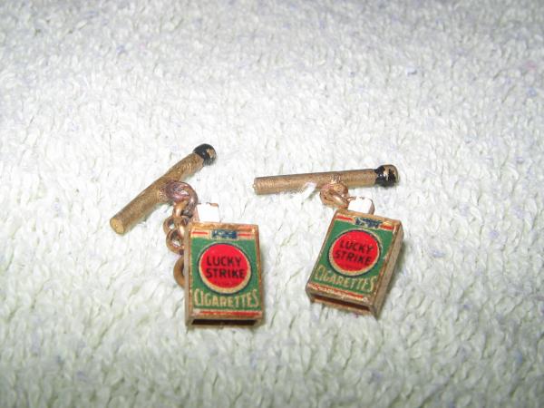 Lucky Strike Cufflinks, backs are solid with no identifying marks. Unable to locate any info on these other than they may have been a "trinket" given away with a pack of cigarettes in the 1940's.