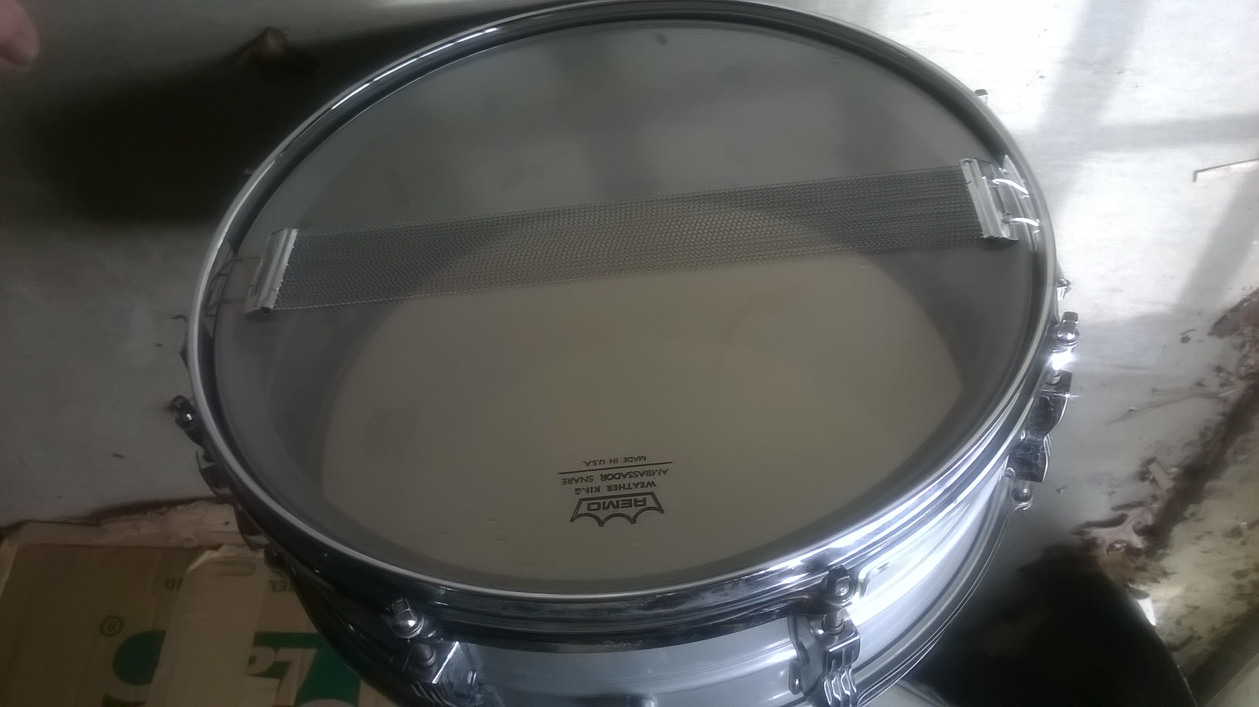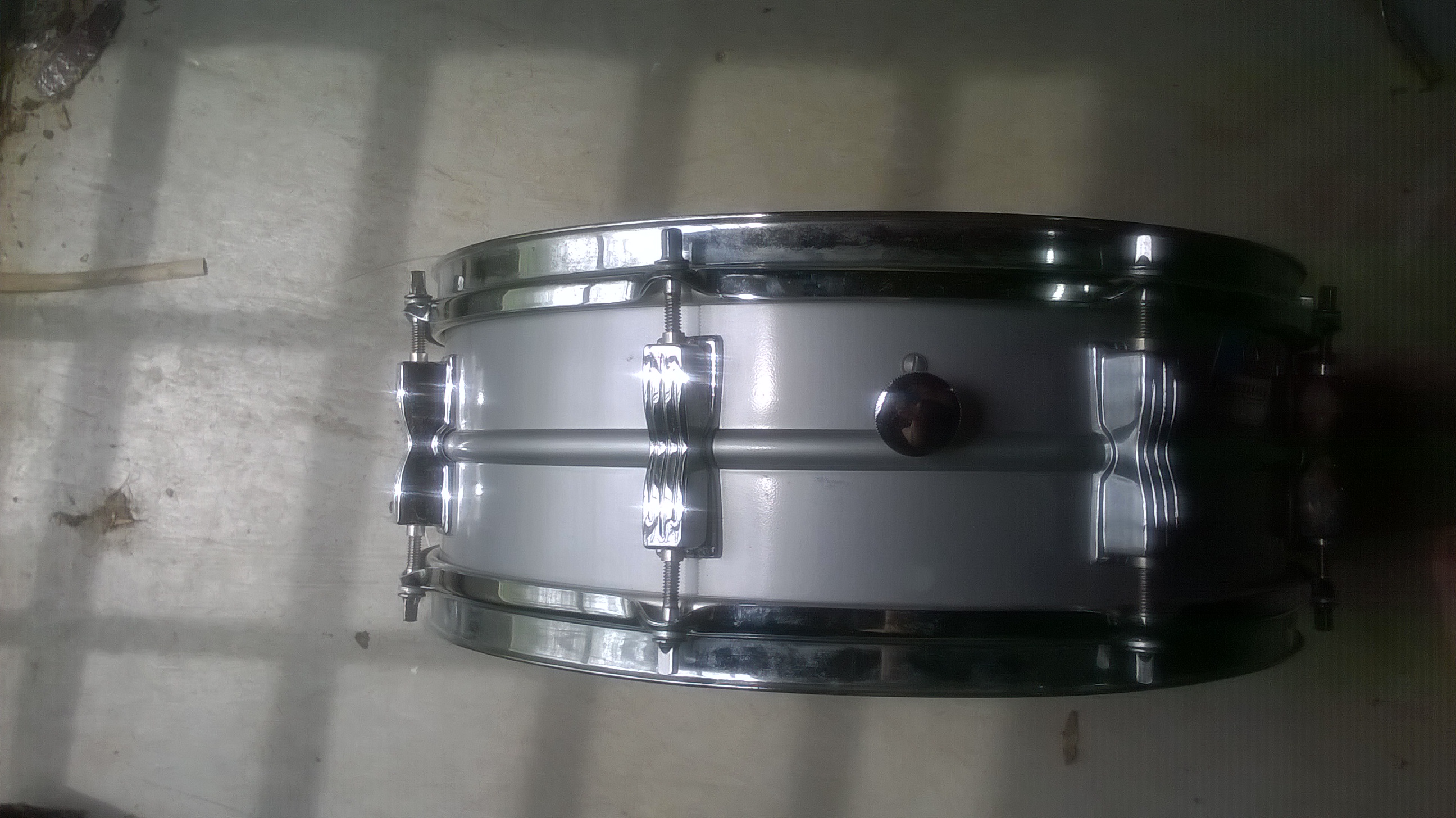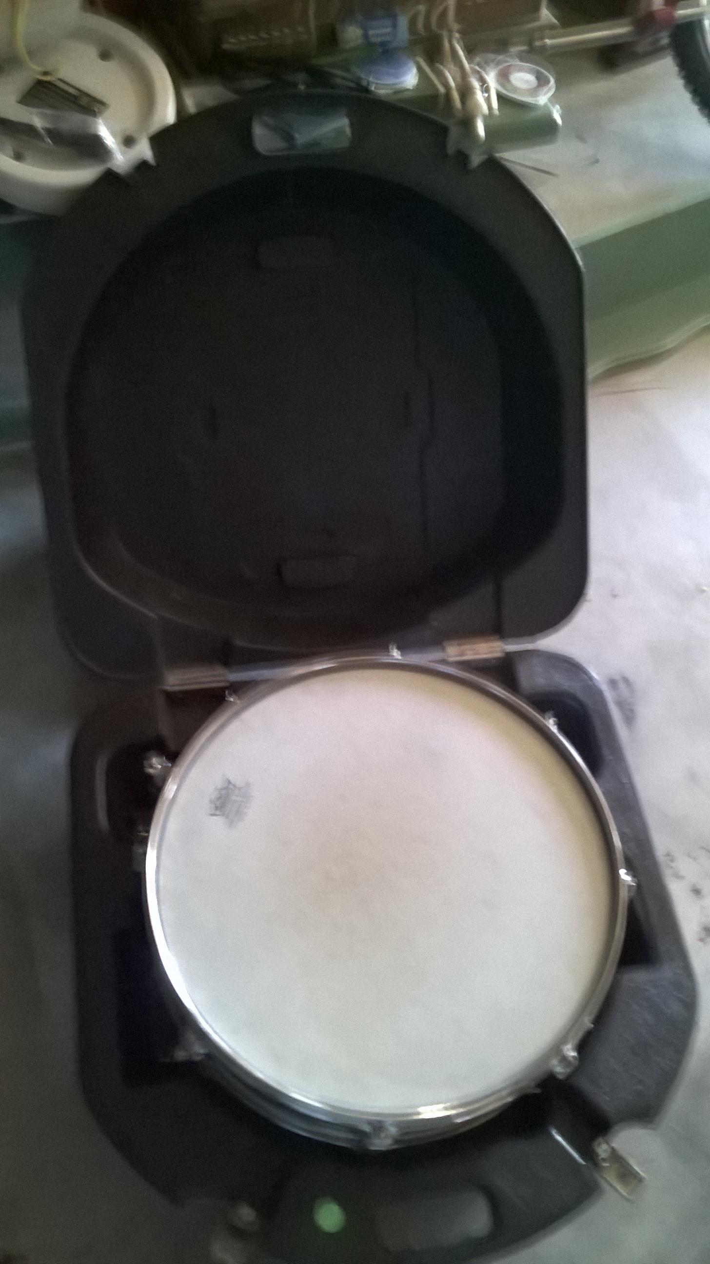The drum has a blue/olive logo on the side. The drum head has some marks from being used, but is intact. The rest of the drum appears to be in very good to excellent condition.