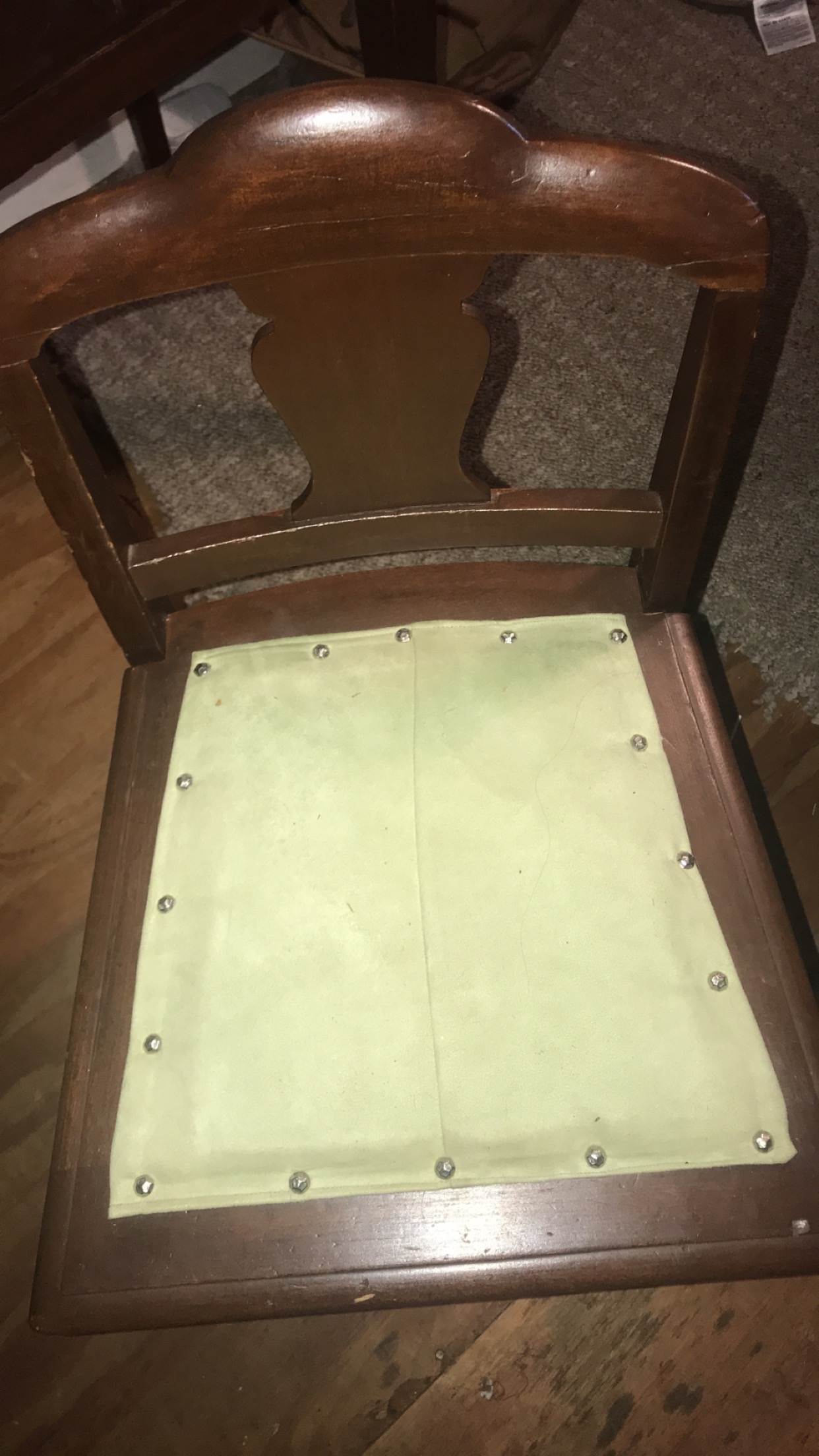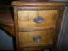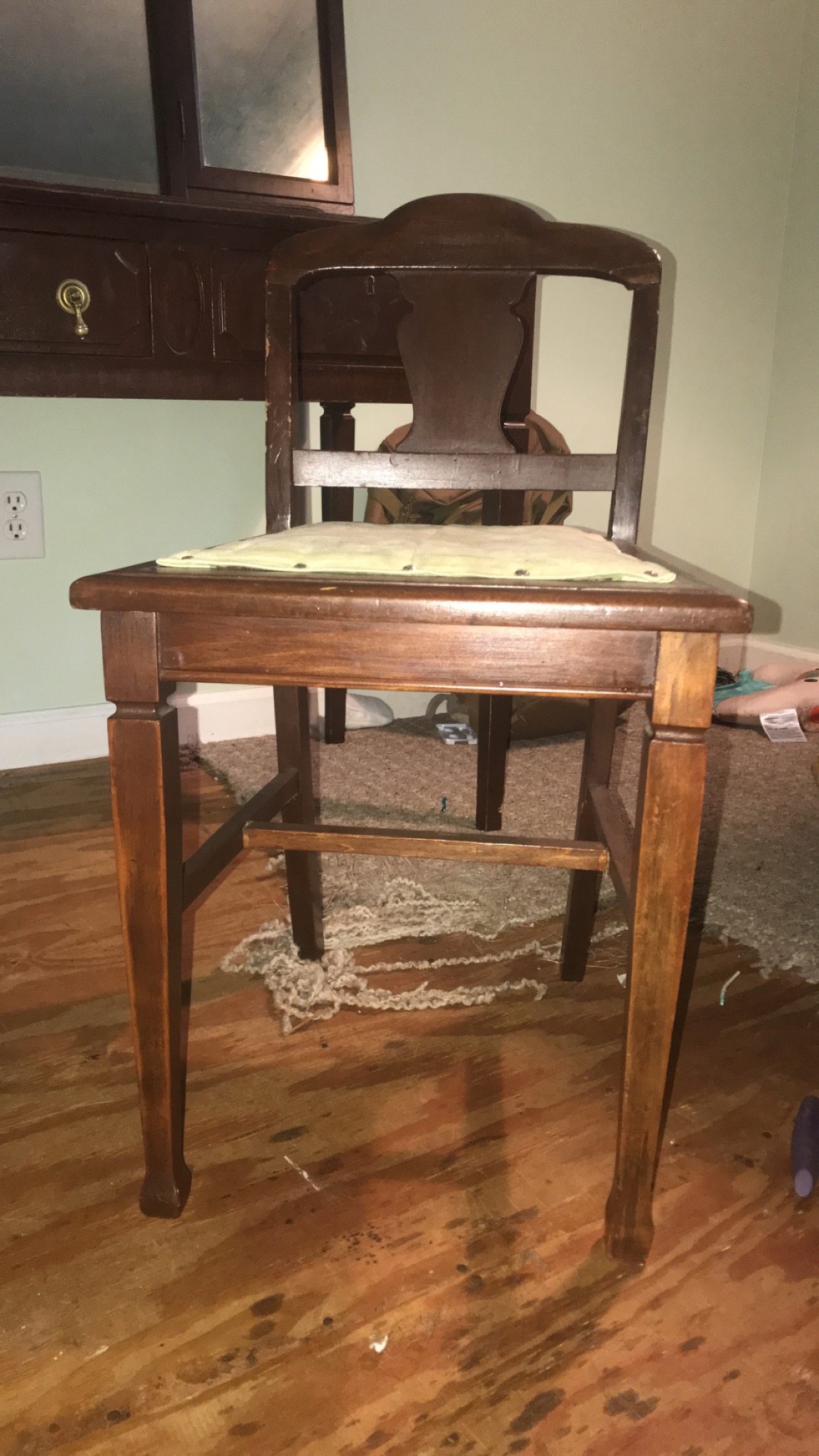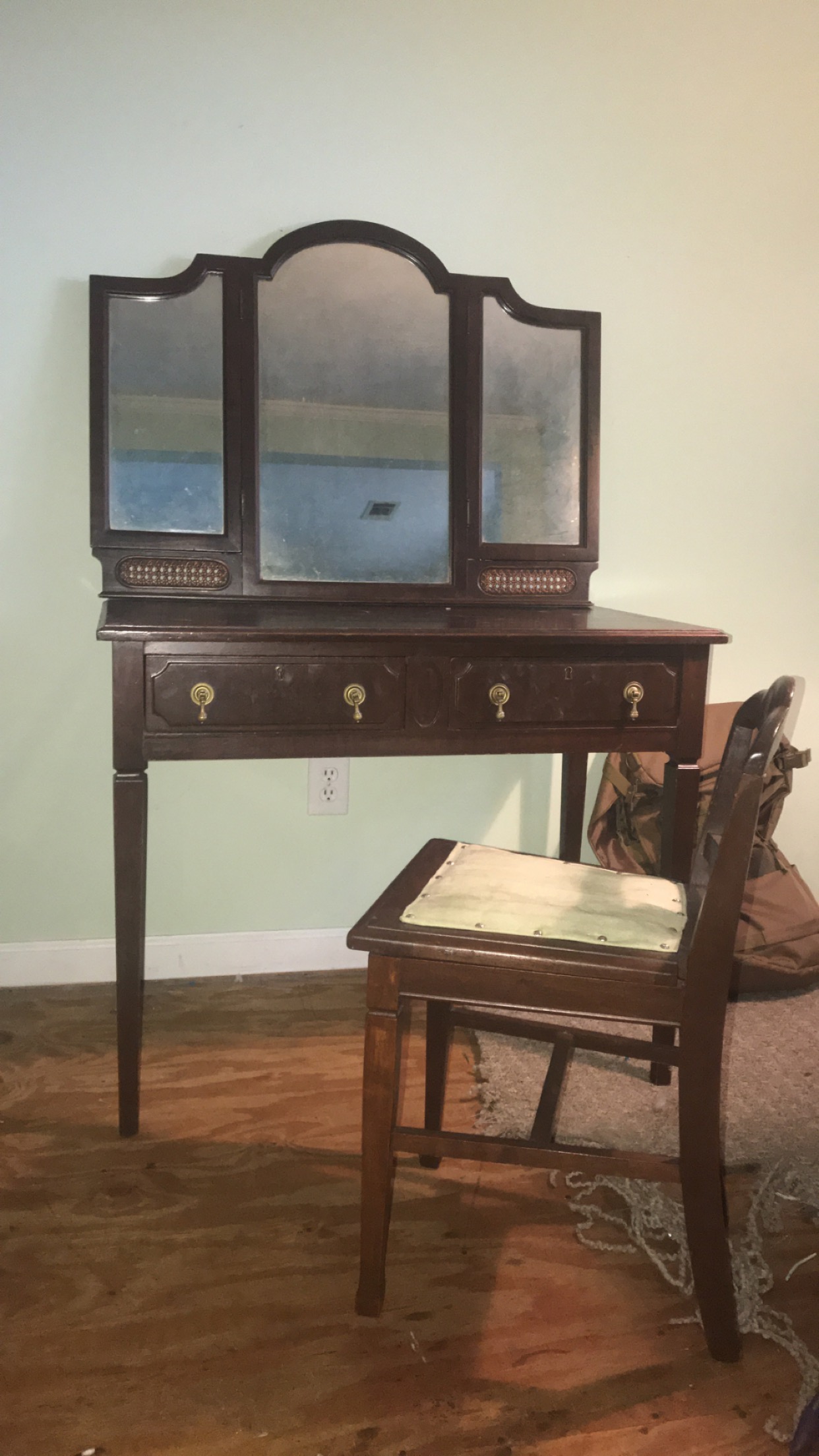Vanity with 2 drawers that have tear drop bail knocker drop pulls with back plates, both drawers have key holes. Tri fold mirror with wicker pattern on bottom. Tapered legs. Vanity chair has a low back with fiddle back. fabric cushion with studs.