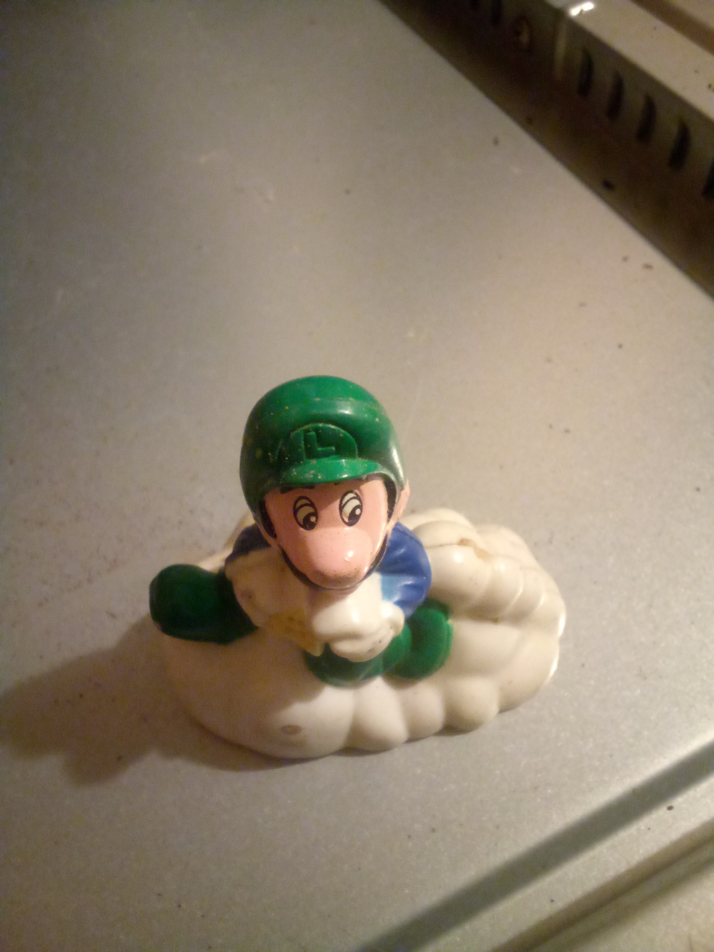 Physical Description: This Luigi figure from the Super Mario Bros franchise is made of plastic, featuring Luigi riding on a cloud. The dimensions of the figure are approximately 1 inch tall, 1 inch wide, and 2 inches long. The distinguishing marks include Luigi's recognizable green hat and his characteristic facial features. The base of the figure has a marking indicating copyright by Nintendo of America, Inc. from 1989, along with the manufacturing details.