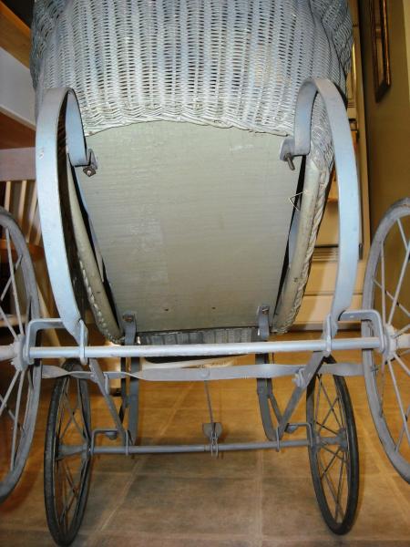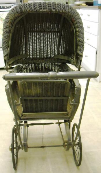 This is a light blue wicker carriage with a foot brake and adjustable hood. It has a latch end allowing for child access on the pushing end. Rubber on wheels are present. No broken spokes. In decent condition, apparently not used as a toy.