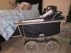 full size baby carriage, approximately 15" wide, 35" length, 22" high at top of siderail area and 36" high from floor to top of hood.