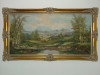 It is a landscape with mountains in the background. The frame has a 3" place where a small band od plaster is missing, a wrinkle in the bottom left canvas, and a 2" spot in the clouds that appears to have been retouched ( there is no finish on this spot).