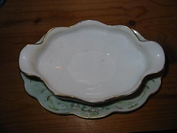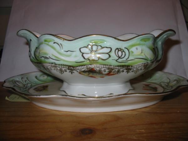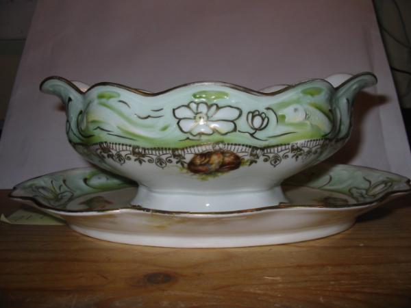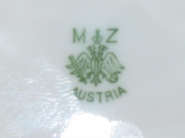 This was part of my mothers collection that she has had for many years. I really don't know a whole lot about it. It looks like some type of gravy boat. It really is a nice piece. The only markings that I can find on it is on the bottom. There is an eagle crest with a M Z on top and the word Austria on the bottom. There is also the number 1221 cast into the bottom along with the number a988 painted in gold also on the bottom. There was a small break on the bottom,but was repaired by who ever my mother purchased it from. If you would like to see additional pictures or have any questions about the piece just e-mail me at [email protected] and I will be happy to either answer your question or send more pictures to you.