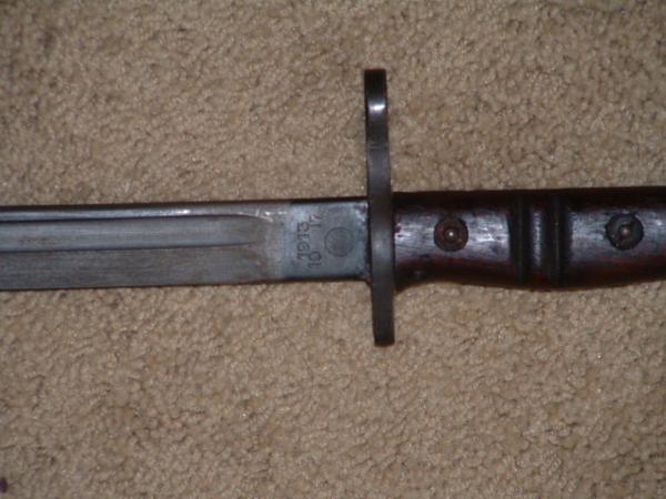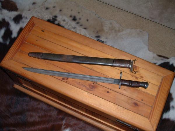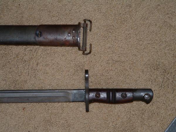 Bayonet has "1913" stamped at the end of the 17' blade at it's base, also "10...17" just below the date. "U S" Stamped on the opposite side. Sword bayonet used on the 30-06 model of 1917. Crosspiece, pommel, ricasso are blued. Rest of blade is parkerized. Scabbard is leather with the M1910 belt hangar an itergral part of the locket. Minor, light rust spots on the locket. Initials "HS" stamped on one side of the rib and "1911-1918" stamped on the other side of the rib.