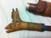 On the right side of the blade (with the sharp edge facing you) there is an indian head with a large headpiece that looks like it is made from feathers with smaller feathers on the bottom and increasing in side as the feathers go upward. There are also many native designs on this side.