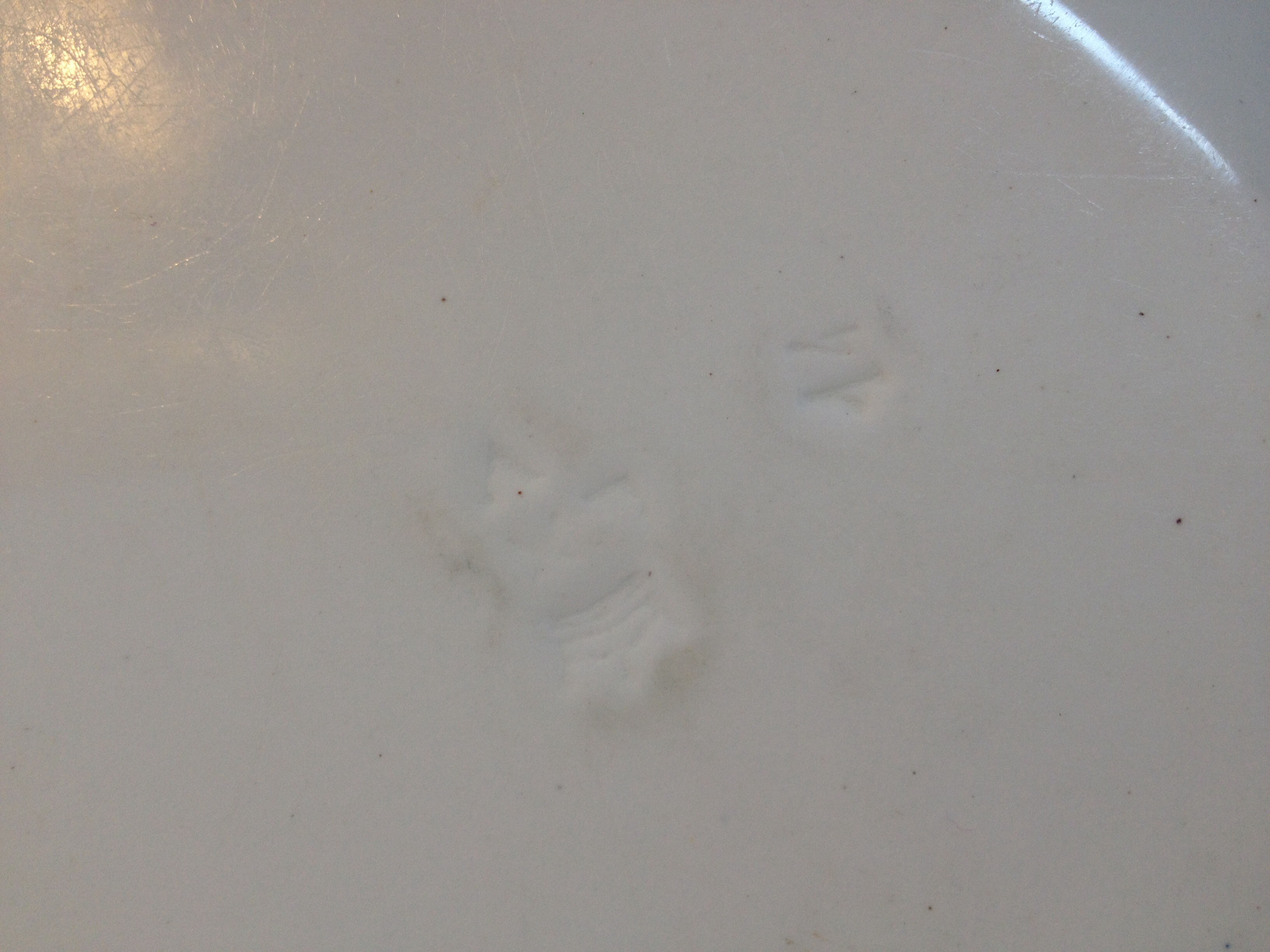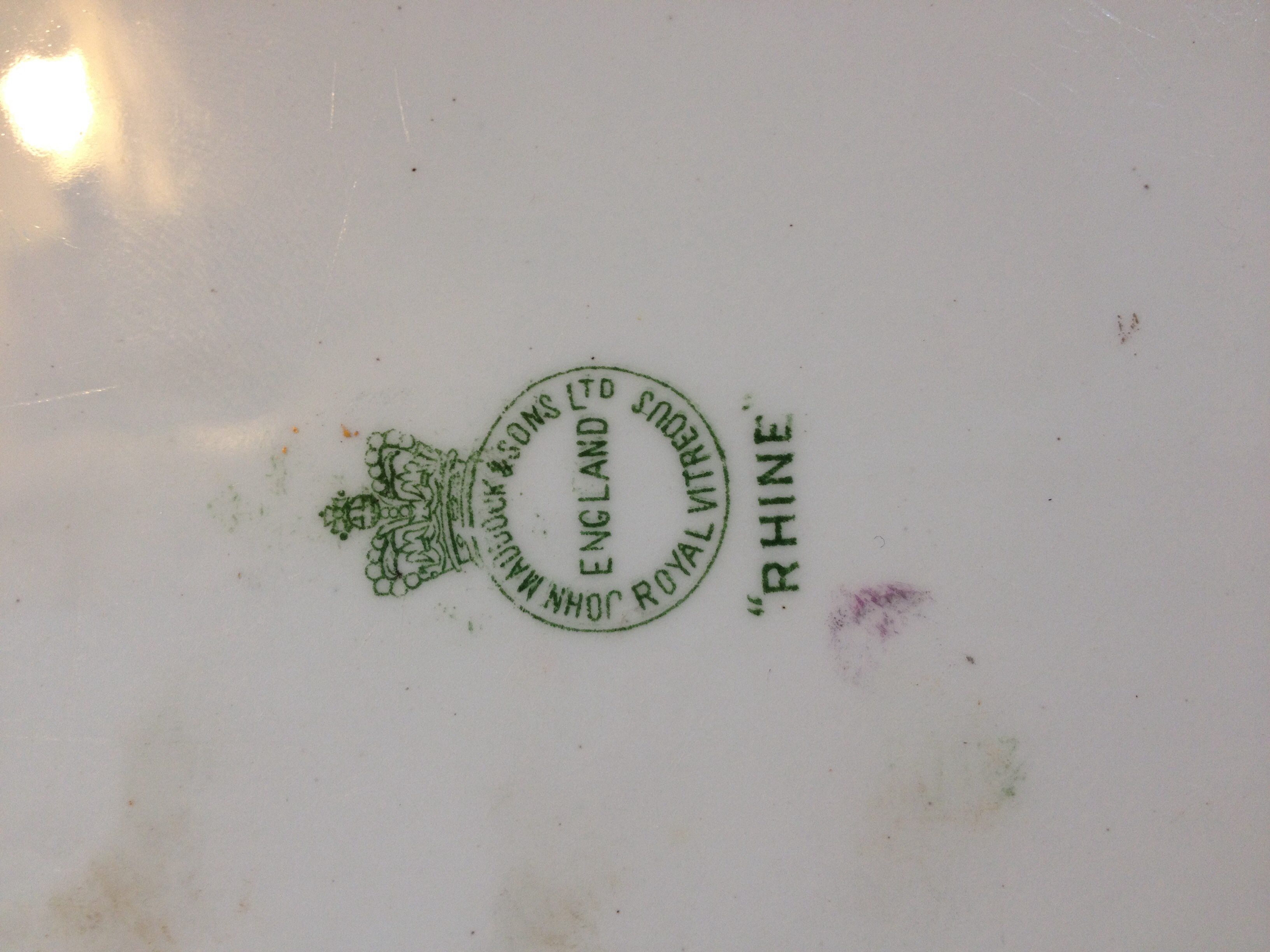 Oval serving dish with gold around trim however some is worn off. Appears to have been slightly used for there a few scratches on it. It has impressed in the back what looks like a crown with ltd and then about 1/2 inch below that the number 14. I am windering what the value of this platter might be if anyone knows anything about it.?!