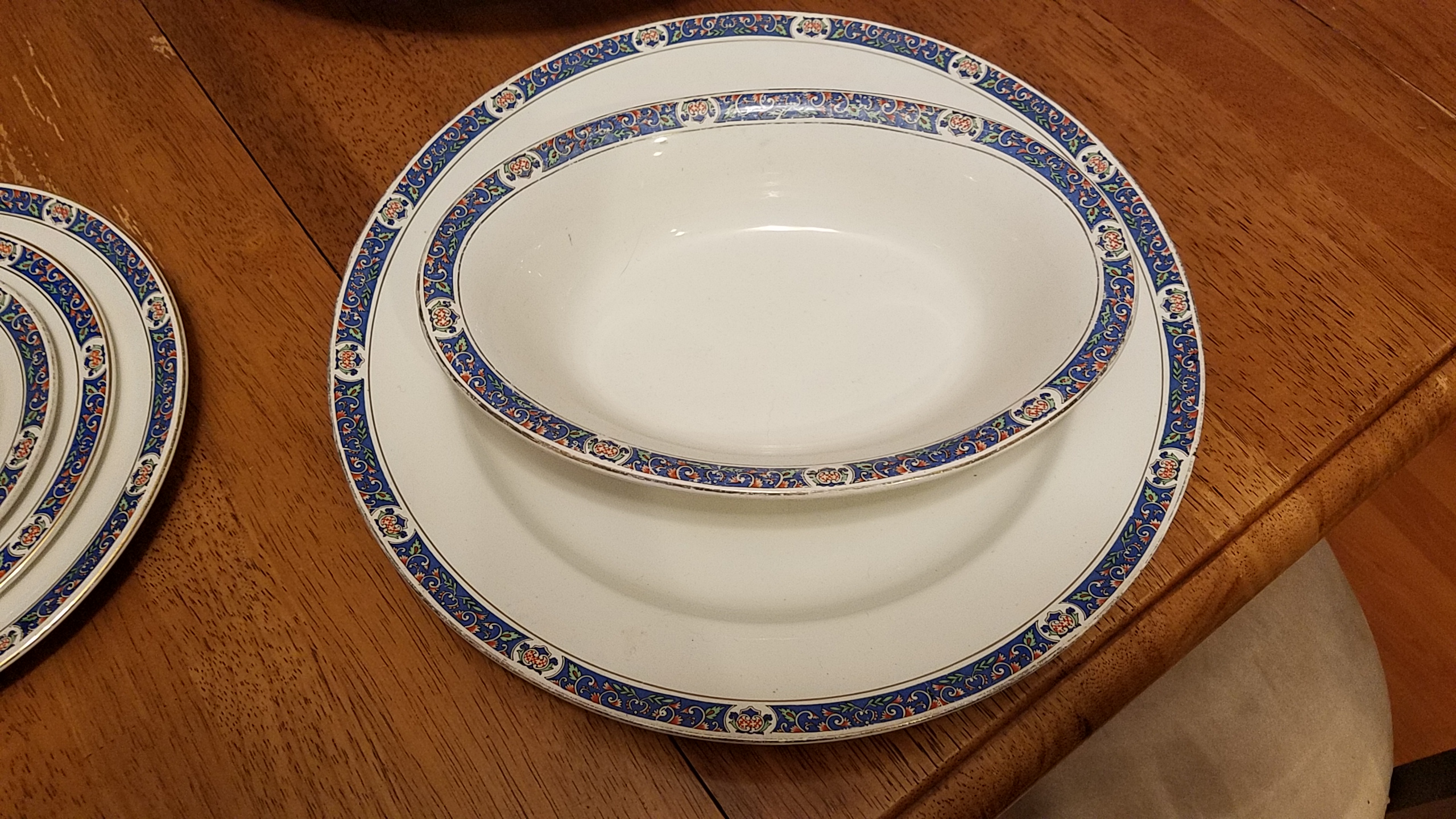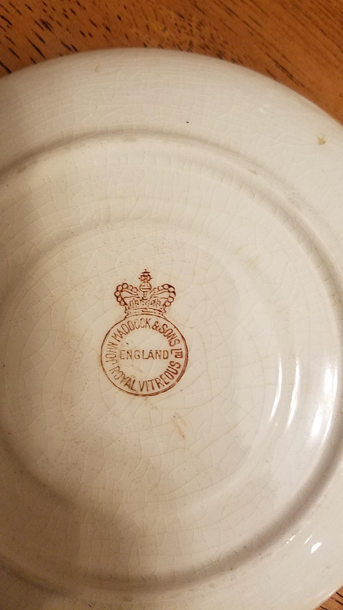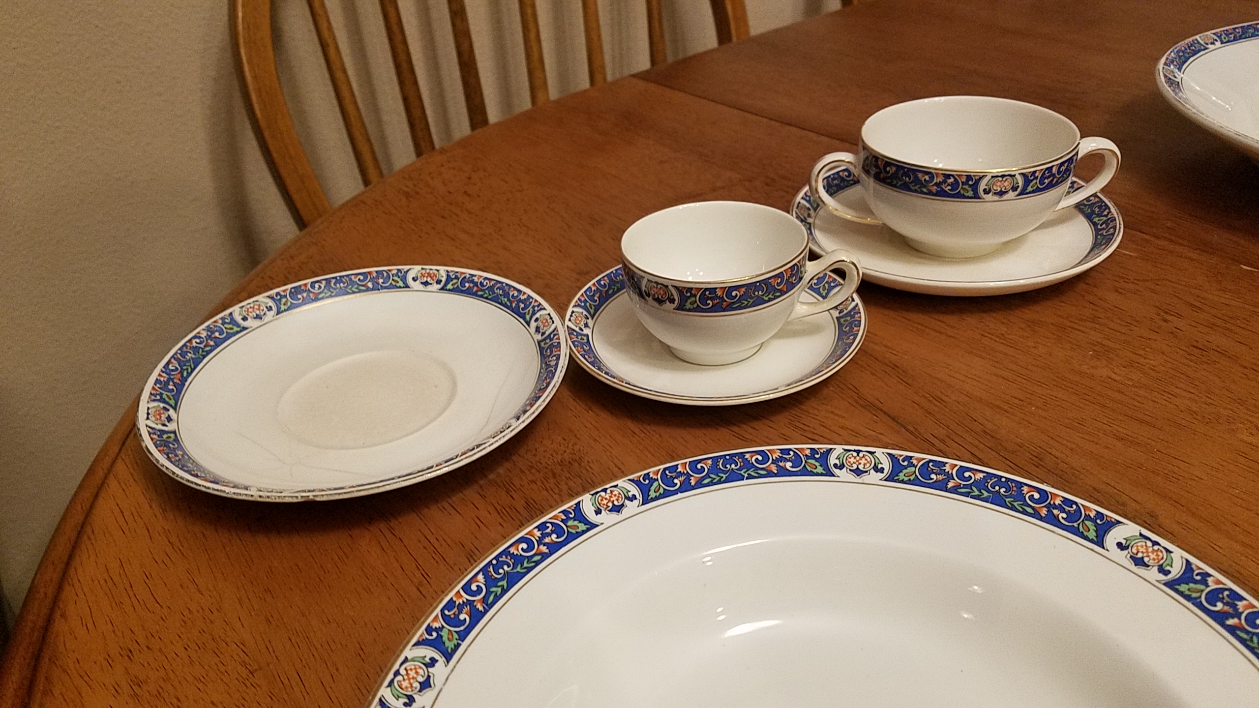 I have a China set from my grandparents who received it from my grandfather's mother Dorothy Godfrey Wayman,and I'm curious what the name of the pattern and what year it is from. I know that it is pre 1896 when they started printing LTD on they're marking. Any information I can get I would appreciate. I have one large oblong Platter, 1 large round platter, 2 oblong serving bowls a pitcher, 7 tea cups, 5 2-handled cups, 11 dinner plates, 6 soup bowls, 10 teacup saucers, 5, larger saucers with Cup indentations, + 5 saucers that seemed more like bowls or a little bit deeper than a regular saucer with cup indentations. I have 7 but I'm assuming are dessert plates and 11 salad plates. There are a few chips, and yellowing and cracking of the china.