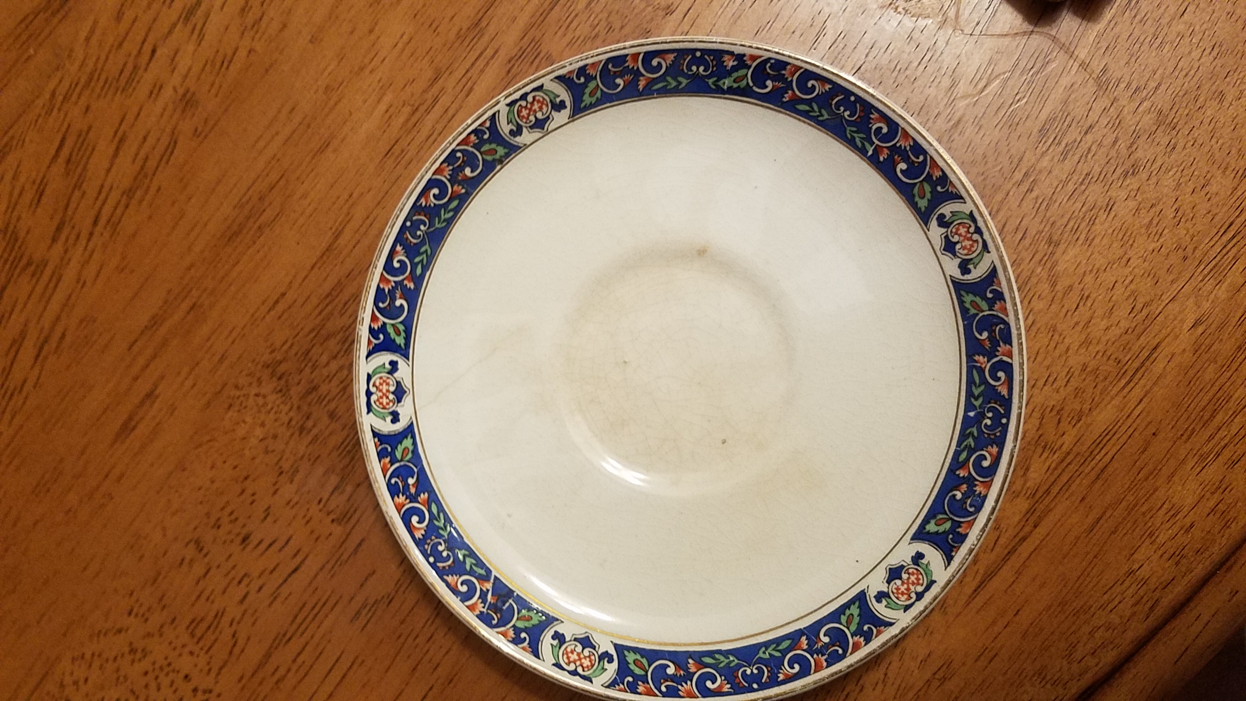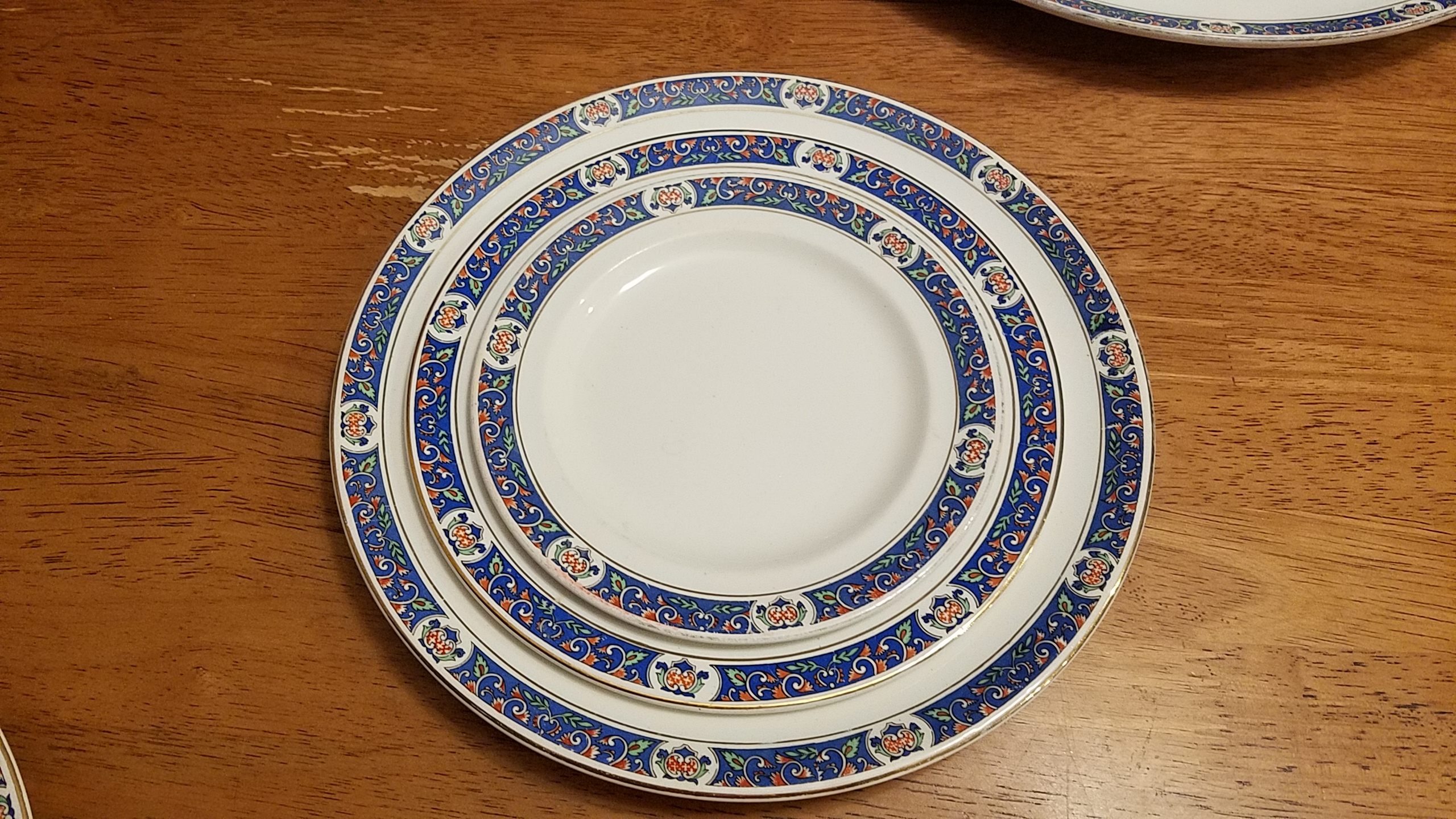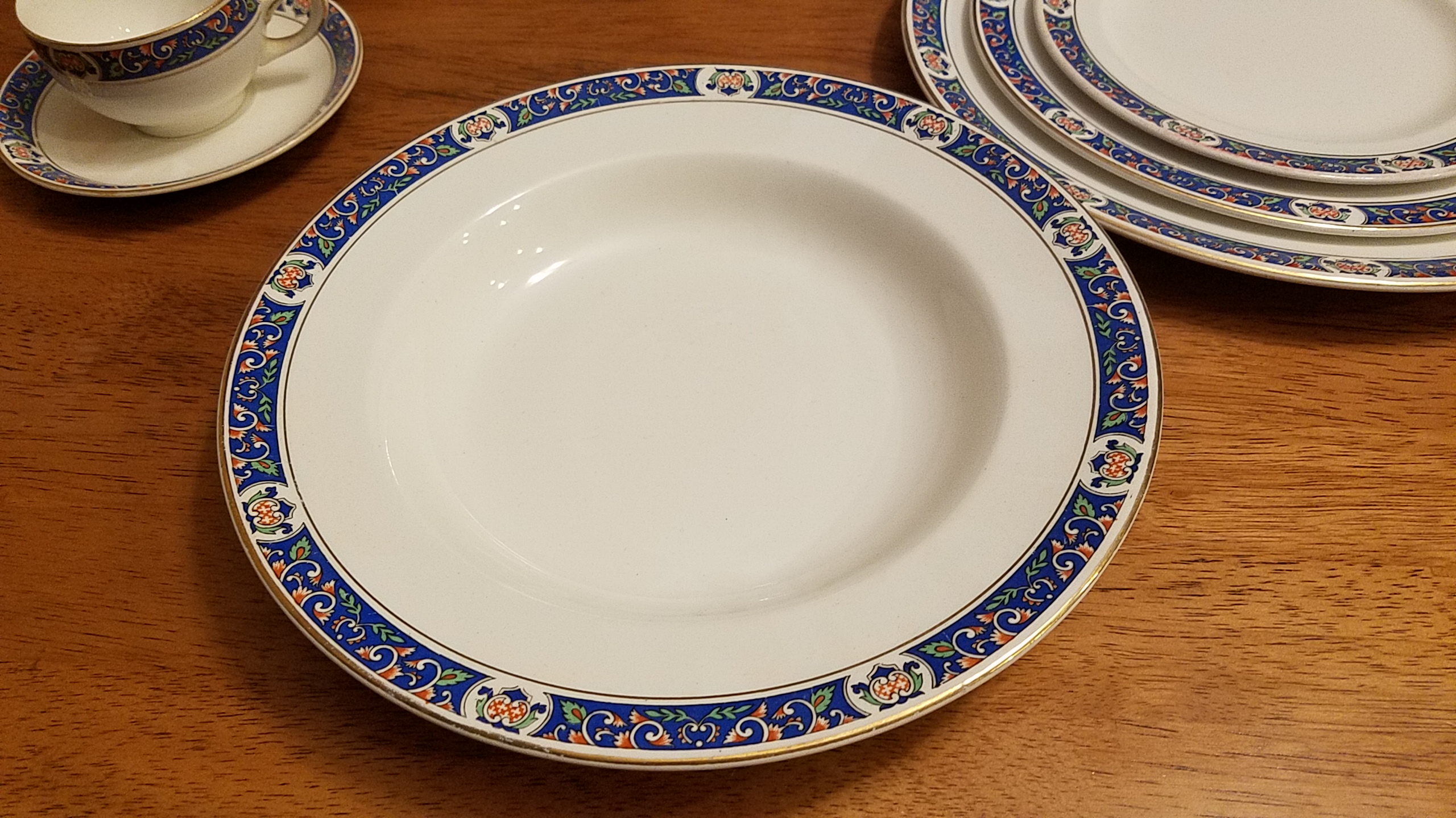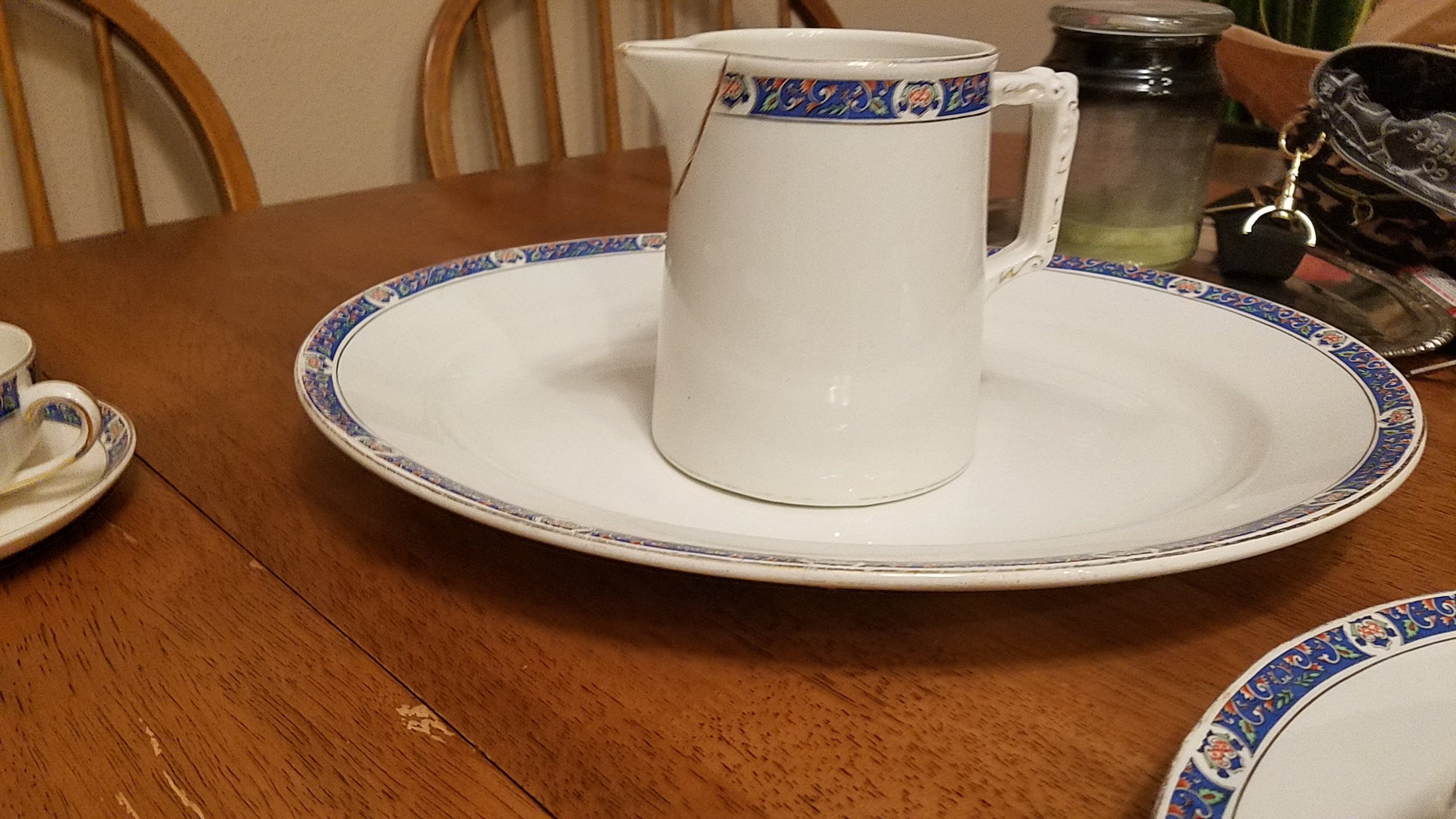 I have a China set from my grandparents who received it from my grandfather's mother Dorothy Godfrey Wayman,and I'm curious what the name of the pattern and what year it is from. I know that it is pre 1896 when they started printing LTD on they're marking. Any information I can get I would appreciate. I have one large oblong Platter, 1 large round platter, 2 oblong serving bowls a pitcher, 7 tea cups, 5 2-handled cups, 11 dinner plates, 6 soup bowls, 10 teacup saucers, 5, larger saucers with Cup indentations, + 5 saucers that seemed more like bowls or a little bit deeper than a regular saucer with cup indentations. I have 7 but I'm assuming are dessert plates and 11 salad plates. There are a few chips, and yellowing and cracking of the china.