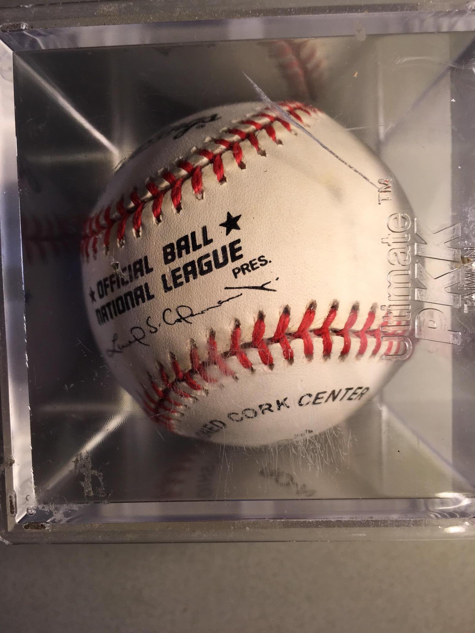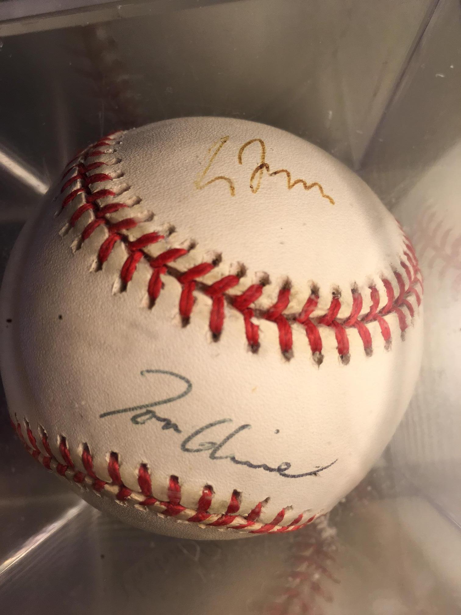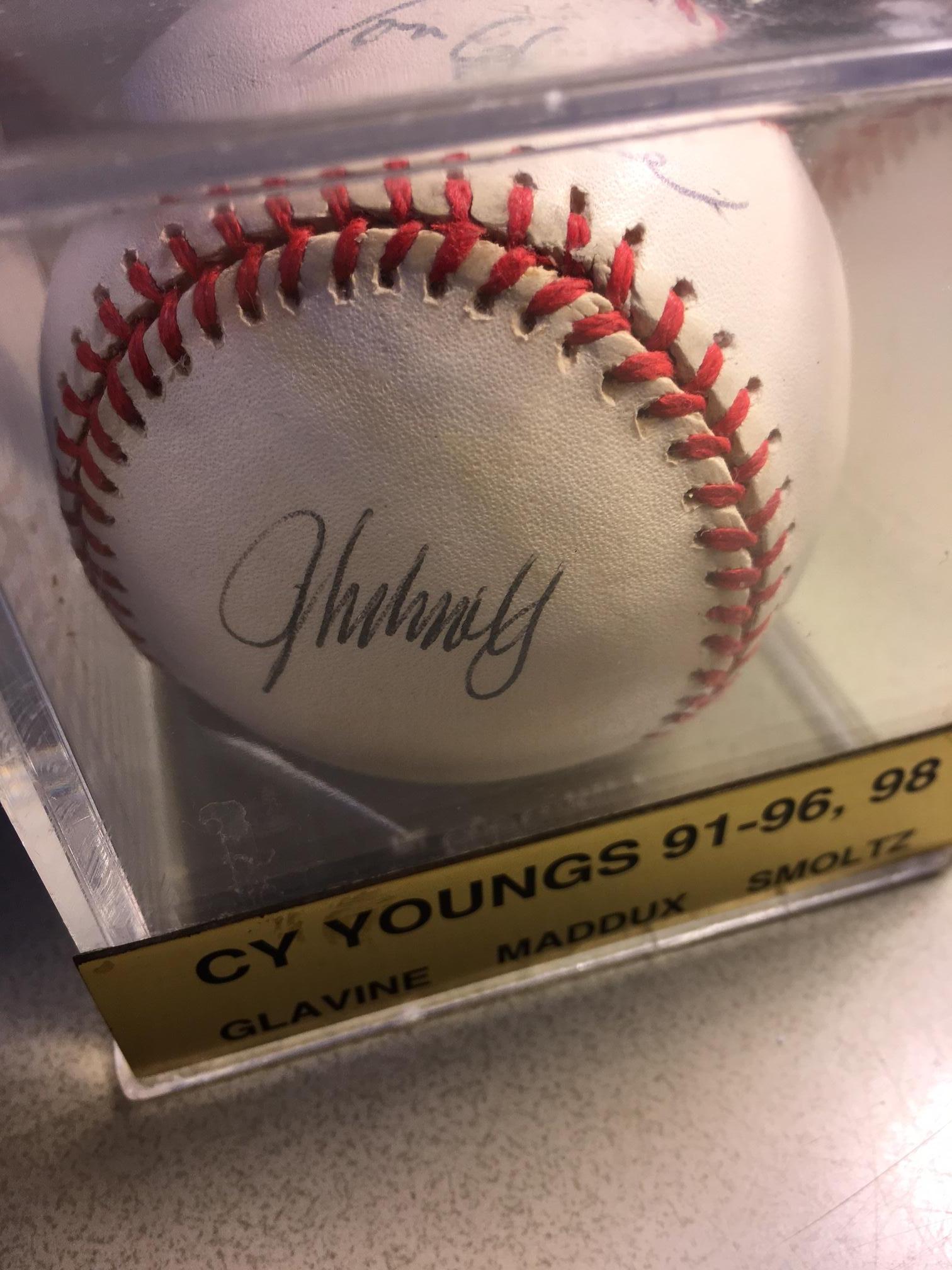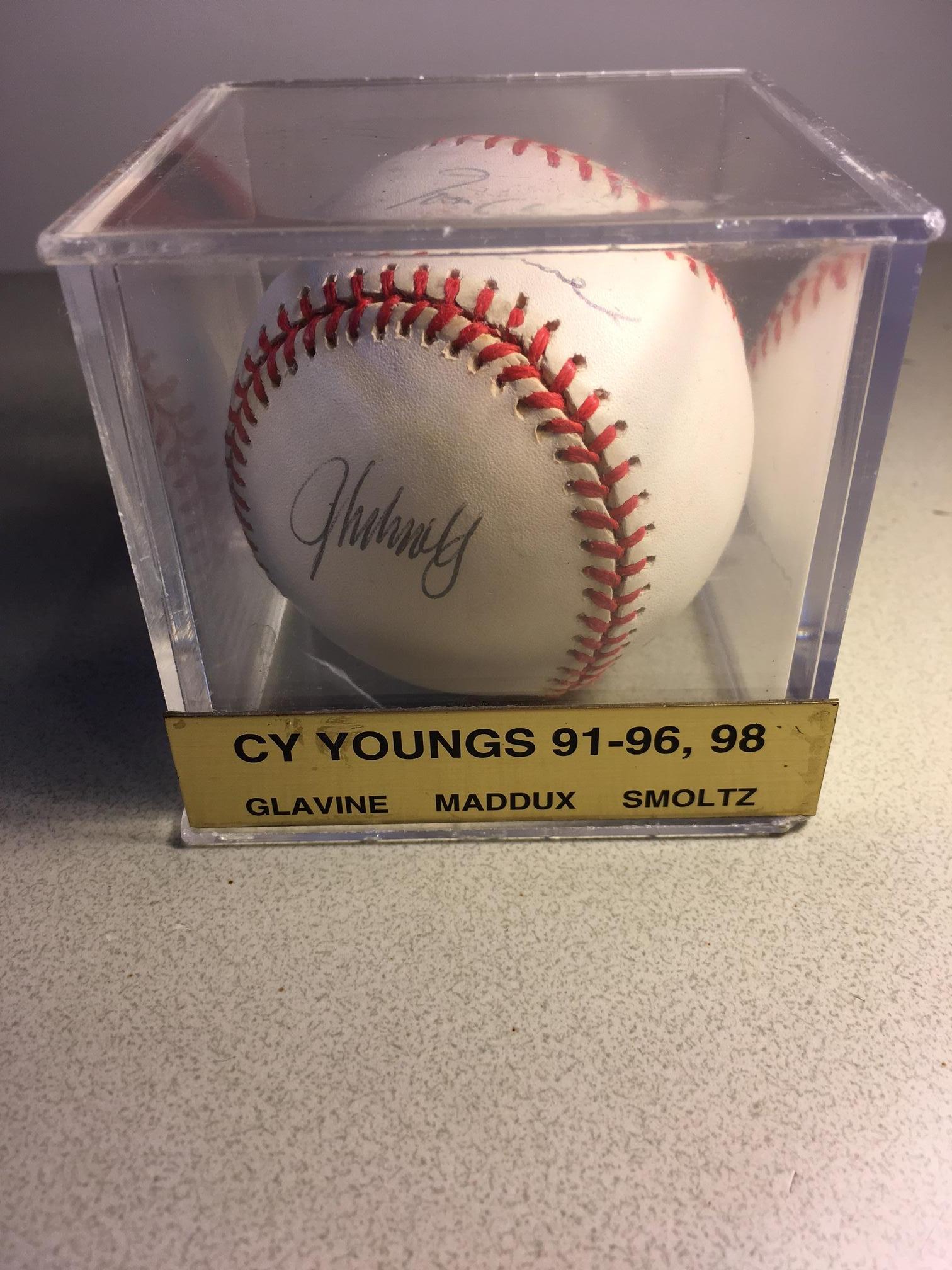 A signed major league baseball from the 90's encased in a protective plastic cube signed by Maddux Glavine and Smoltz with a brass printed inscription reading "CY YOUNGS 91-96,98" below that reading "Glavine Maddux Smoltz".