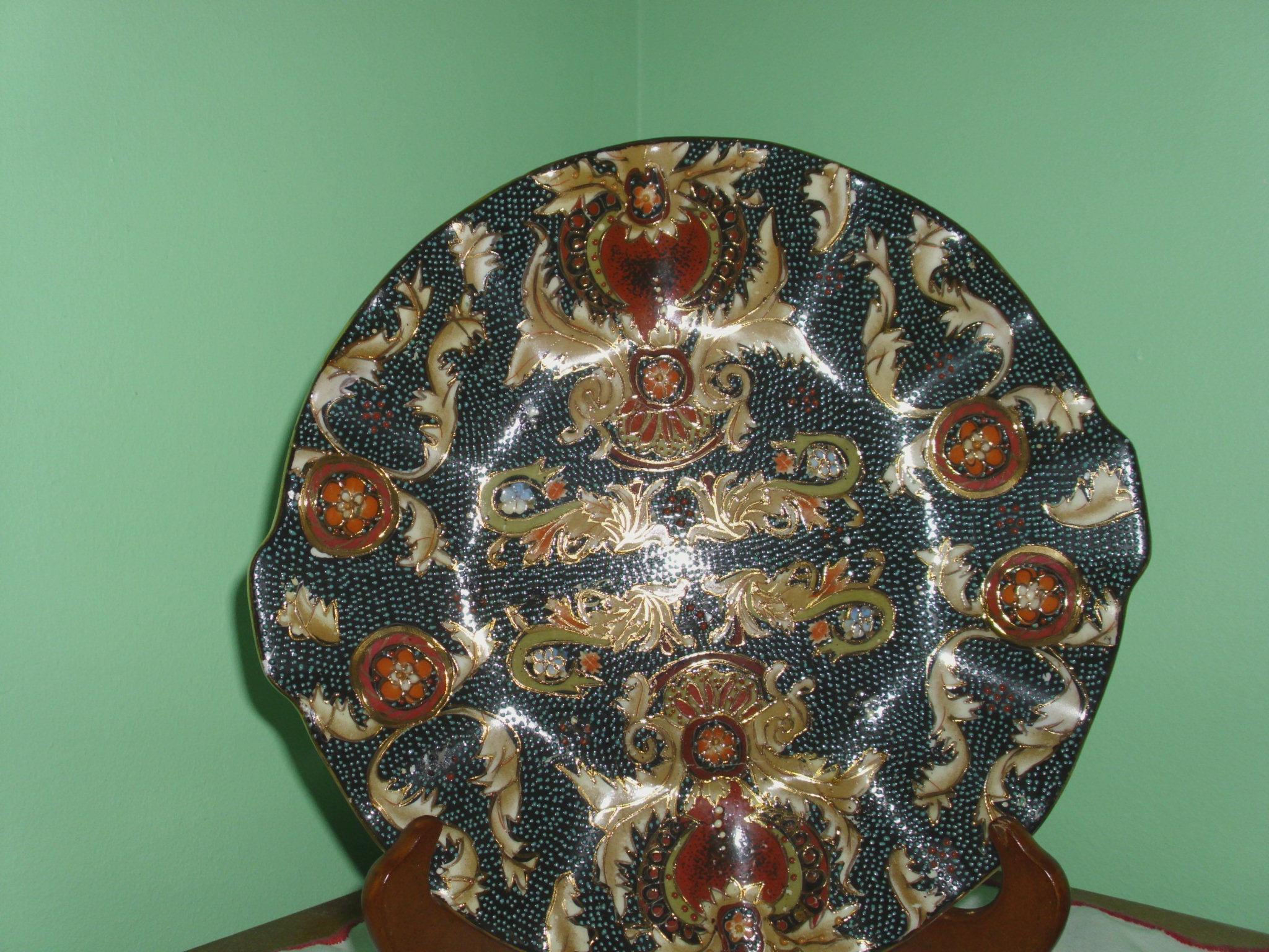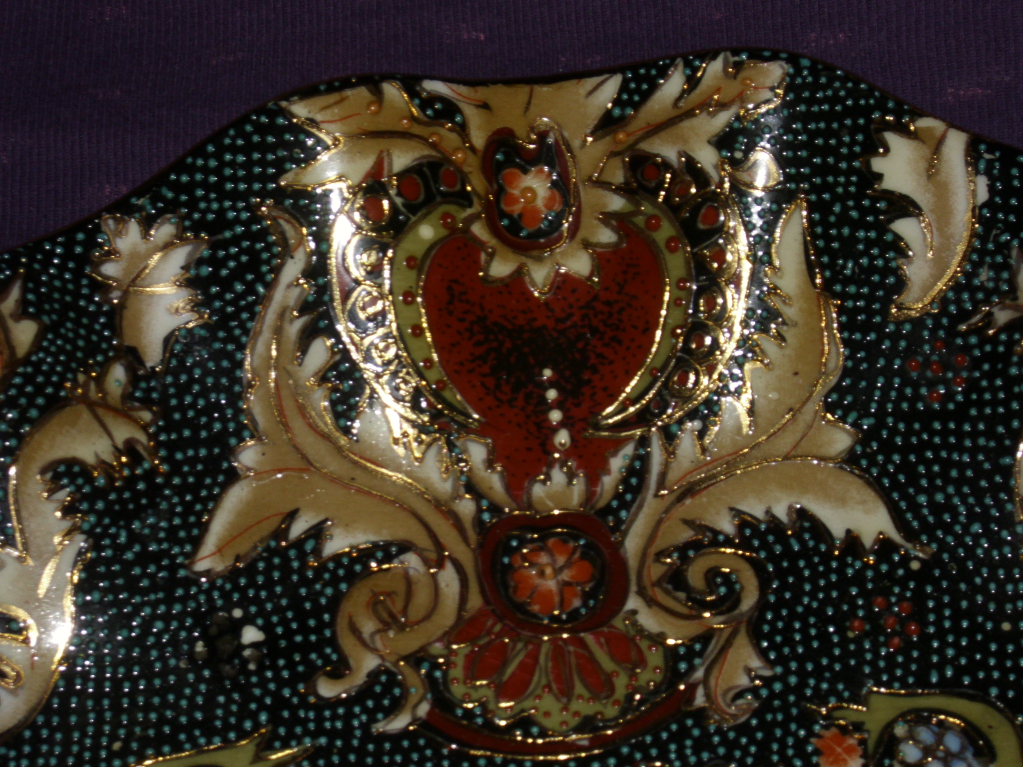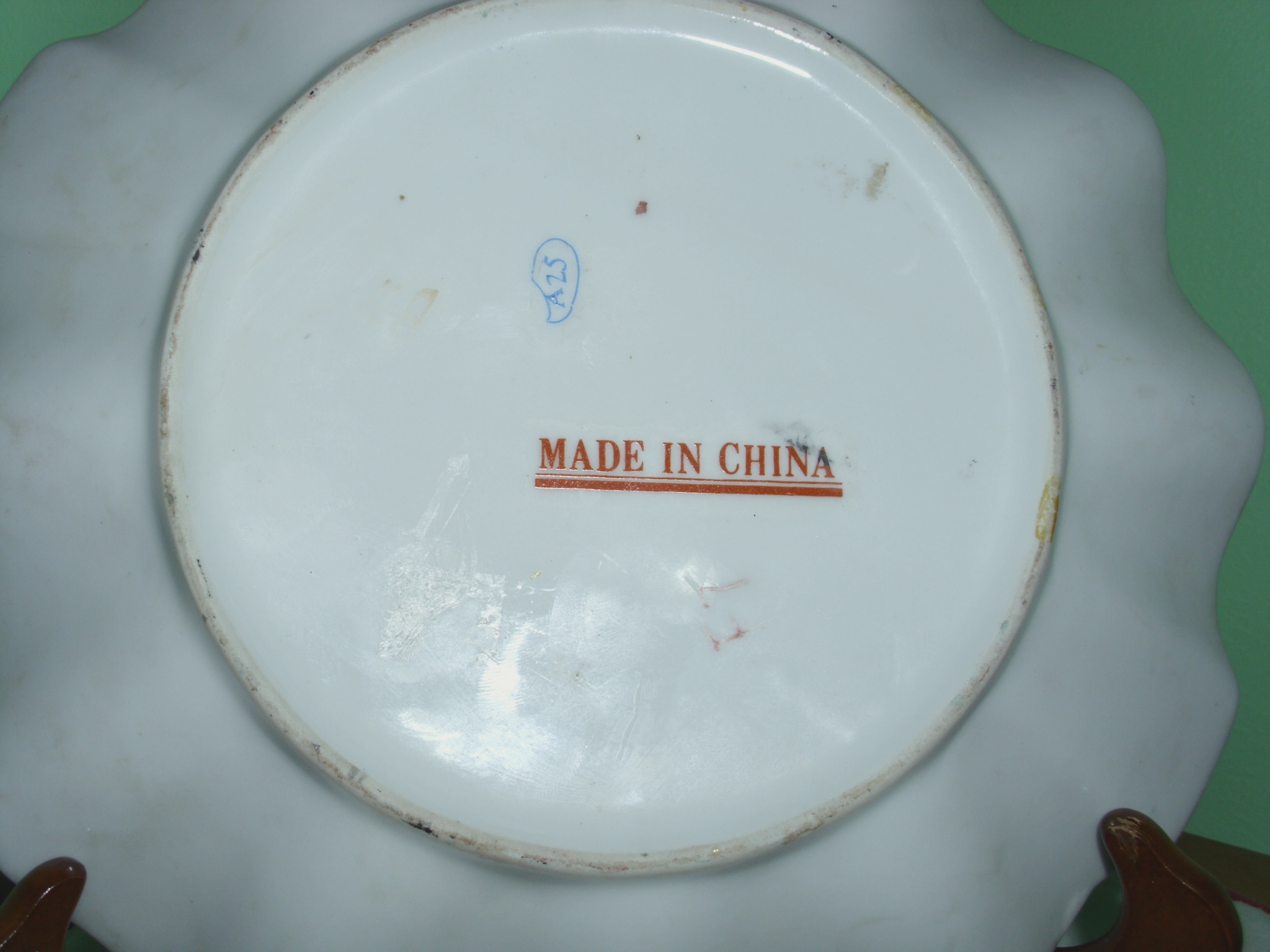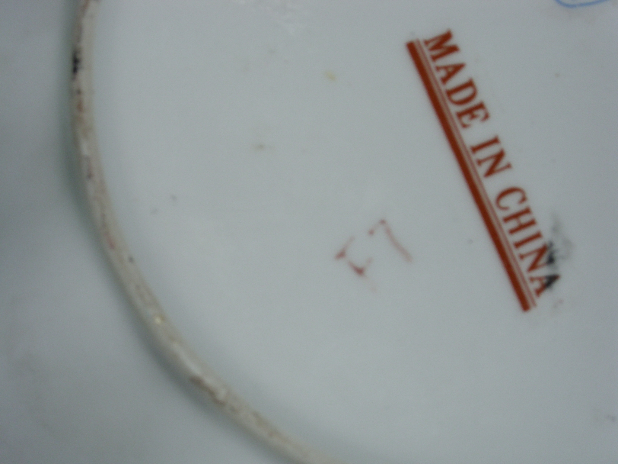 plate is covered w/blueish stippling.The markings on back says Made in China in red with