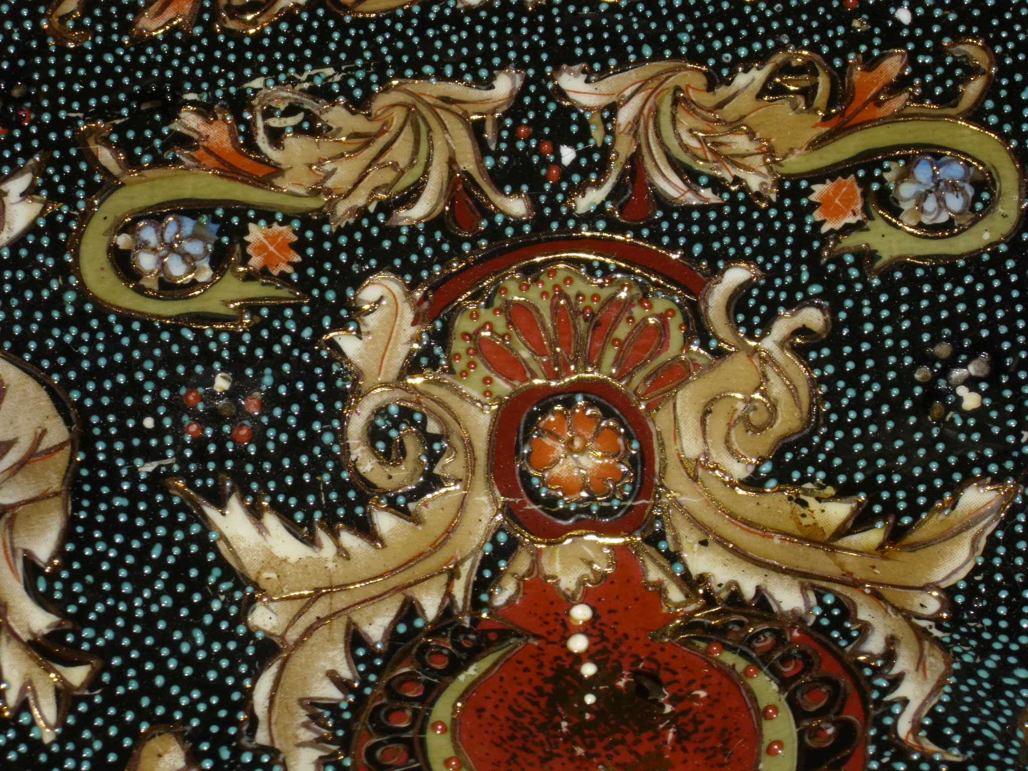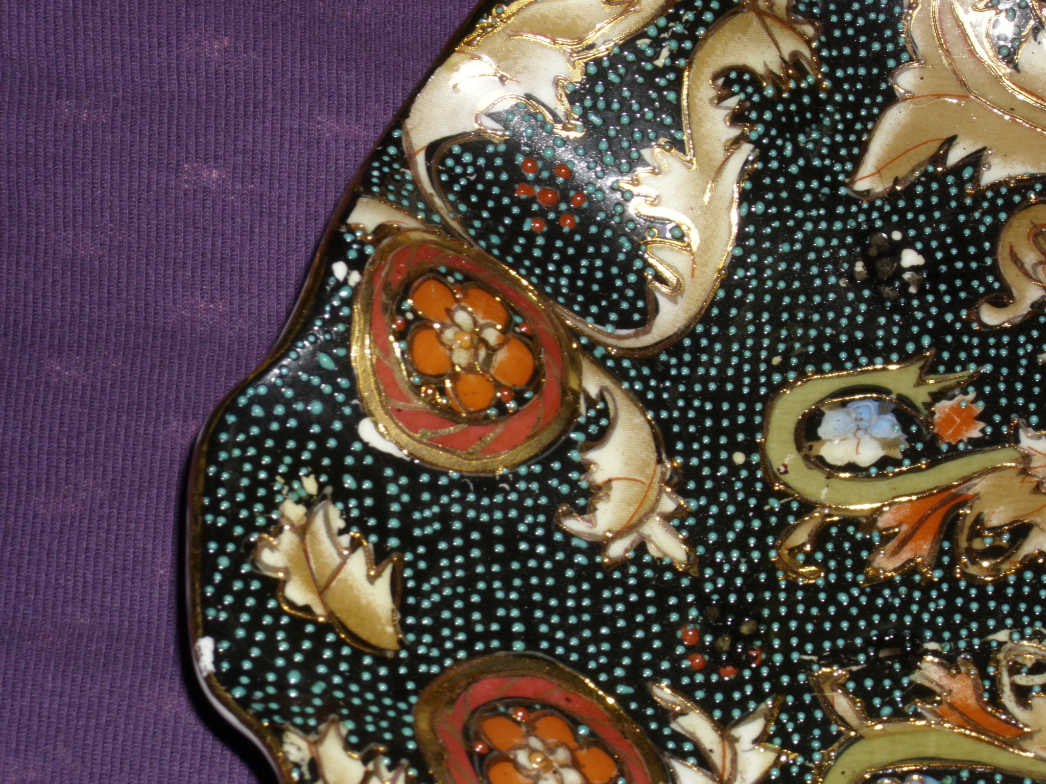 it looks like inlaid dark Mother of Pearl & that has gold trimmed around it,& the whole