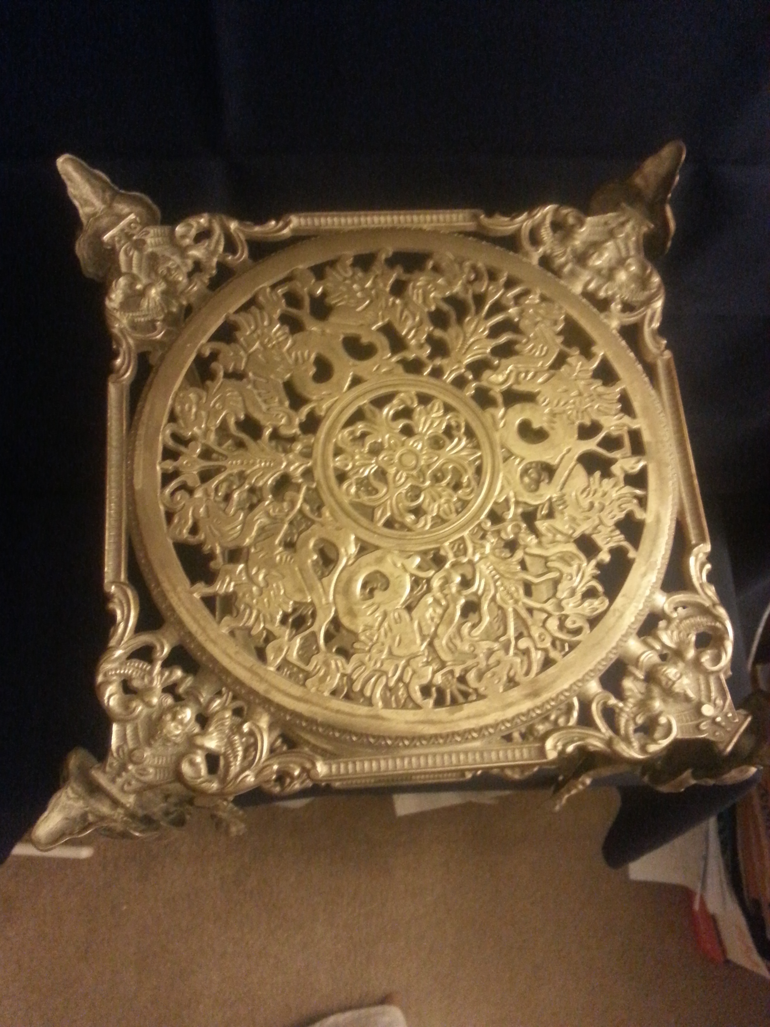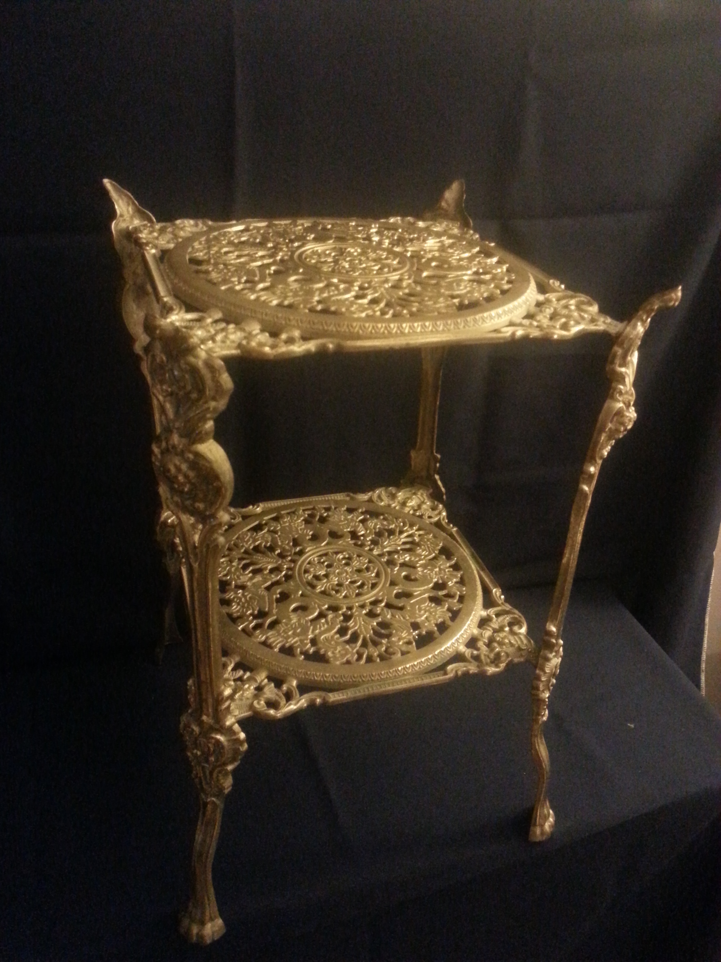 Very ornate with great petina MADE IN ITALY stamped 2 tier brass table, possibly plant stand, high end phone stand. All original screws and in fantastic condition. Several photos posted.