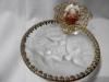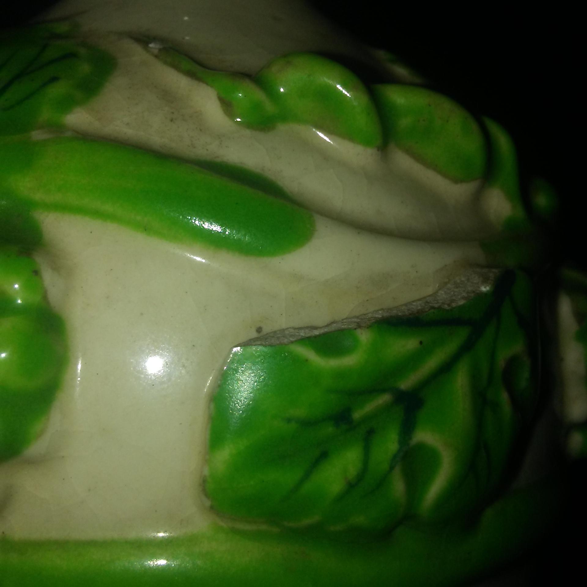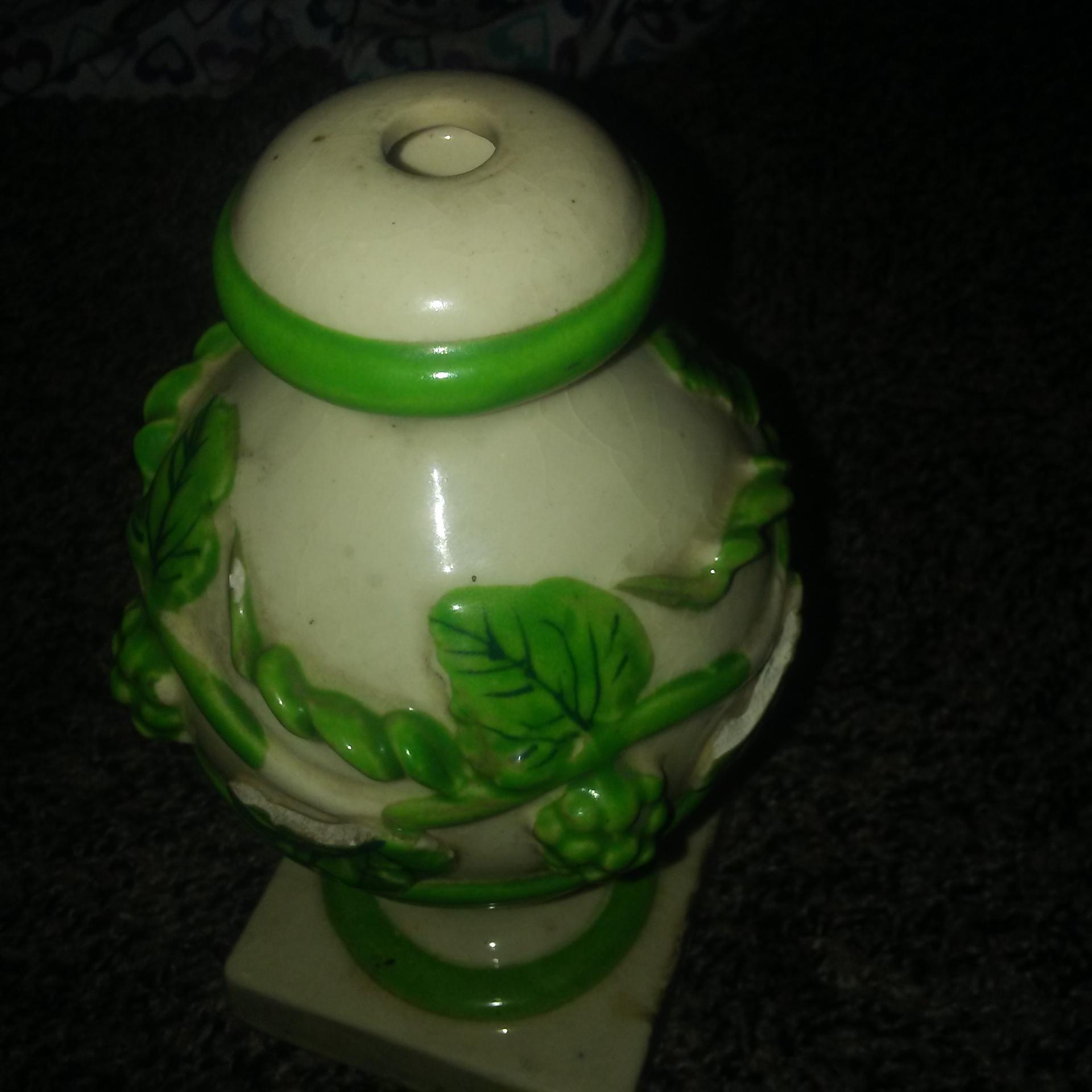 White porcelain i beleive its a lamp has patruding green grape vine wrapping around it. .a couple leafs ob the vine are chipped...has maker stamp underside says made in Japan going around five petal flower. ..