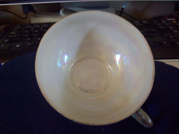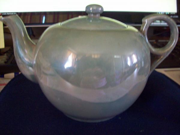 tea set( POT, CREAMER,SUGAR,4CUPS AND SAUCERS) TURQUOISE(MORE GREEN THEN BLUE) WITH MOTHER OF PEARL INSIDE -OUTSIDE HAS A WATER FLOW LOOK- VERY, VERY THIN CUPS YOU CAN SEE YOUR SHADOW THROUGH THEM.I CALL IT EGGSHELL THIN. MARKED" MADE IN JAPAN" WITH A UPSIDE DOWN" T " UNDER JAPAN.I WOULD LIKE ANY INFO I CAN GET AS I WOULD LIKE TO PASS IT ON TO MY GRANDDAUGHTER. THANK YOU IN ADVANCE.
