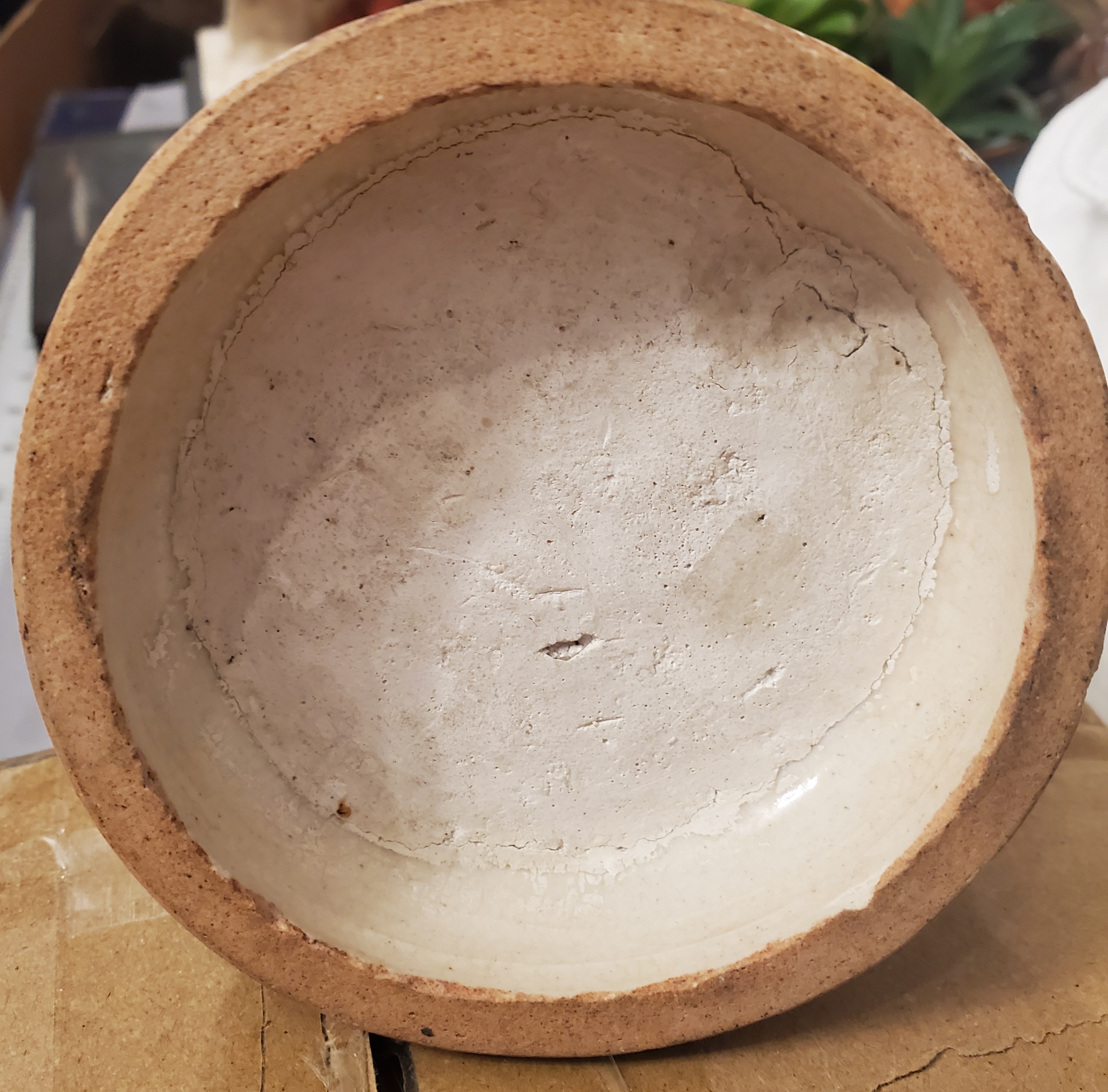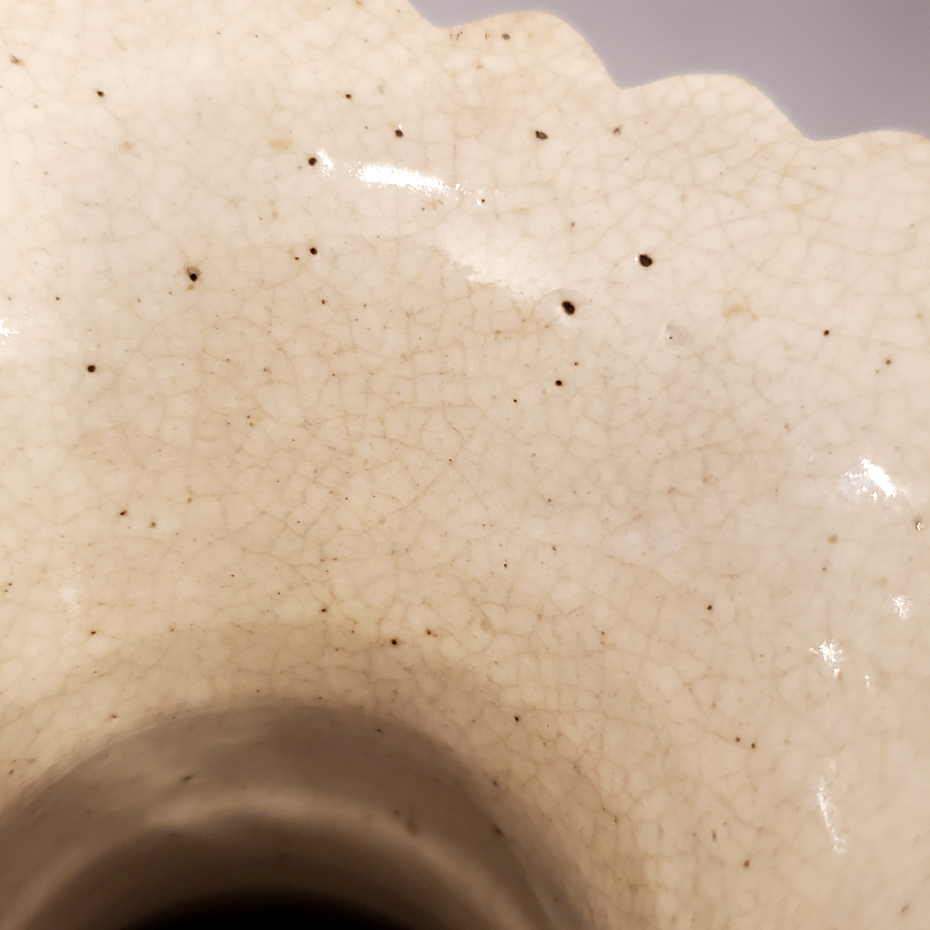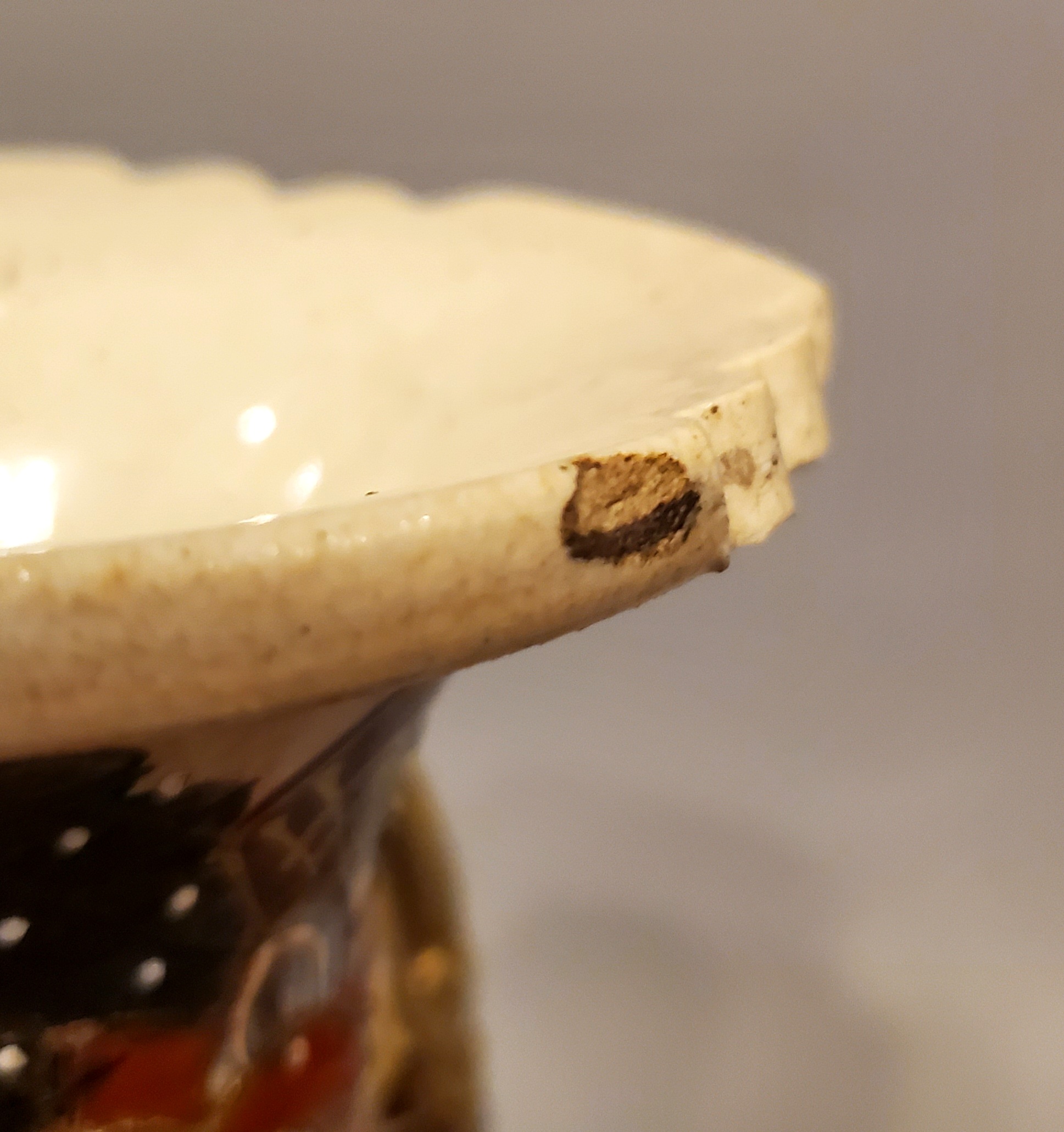 I recall reading something about a crackle glaze that was used on some Satsuma pieces to give a depth of shadow to the painted elements but I'm not confident that is the situation in this case. The clay is quite thick at 8mm and the crackly bits appear superficial and are present only in the glazed areas. i.e. The unglazed rim around the bottom is porous but no crackling is present. What do you see? Do the cracks in these images appear to be from the glaze or does it appear to be damaged?