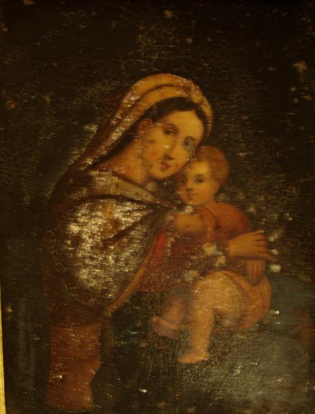 Unknown artist, I'm guessing after Raphael's "Madonna della Segiolla" also known as "Madonna della Sedia", oil on tin, probabbly 19th century