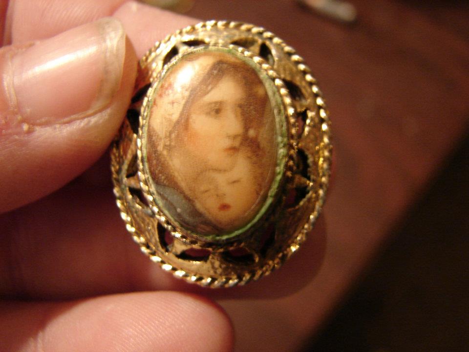 This cameo was bought by my sister in law and she has no idea about it. I kno wthe picture is from 'Madonna of the Streets'. It appears to be in great shape, picture tends to look kind of yellowish color, frame looks gold.