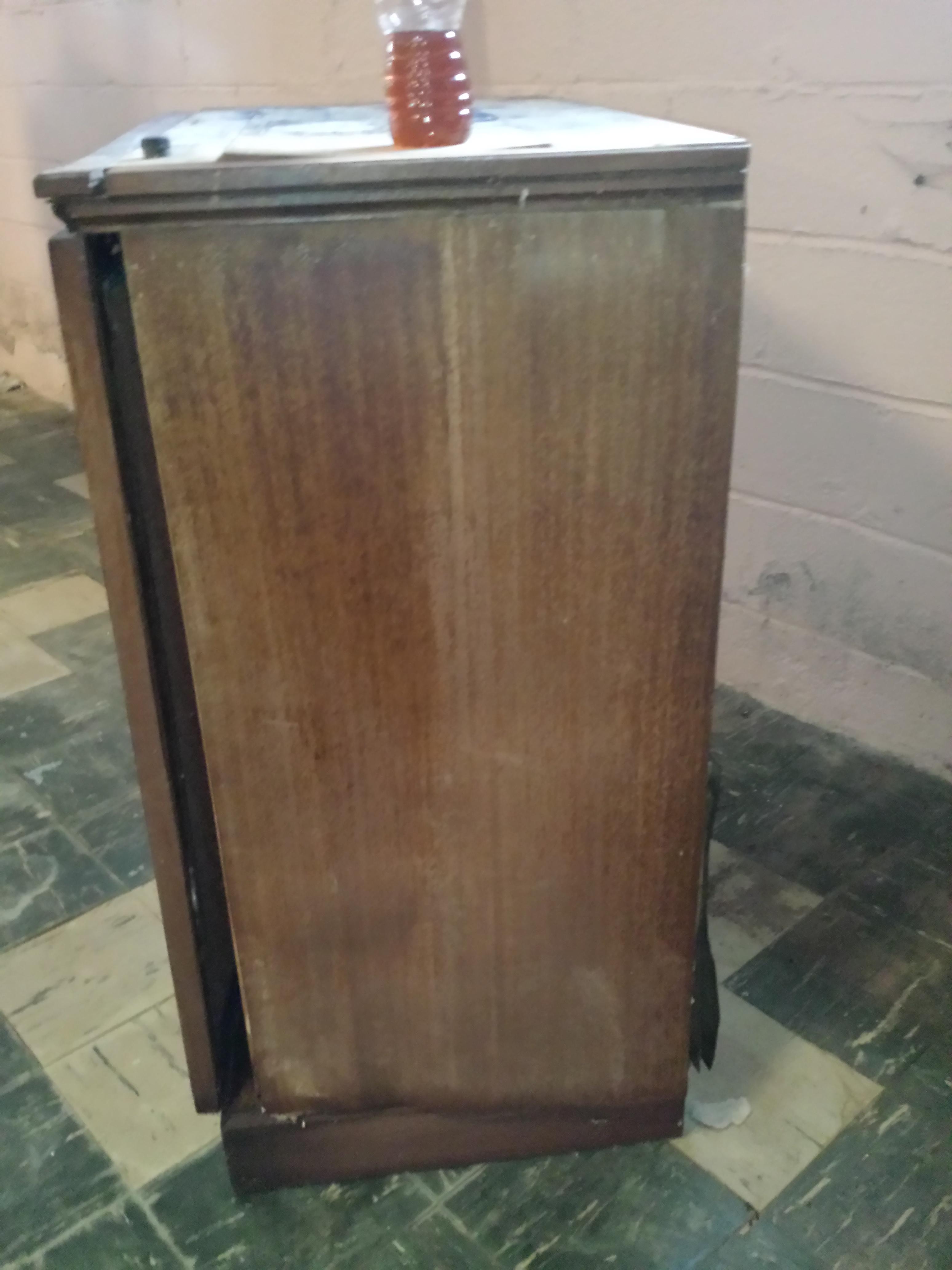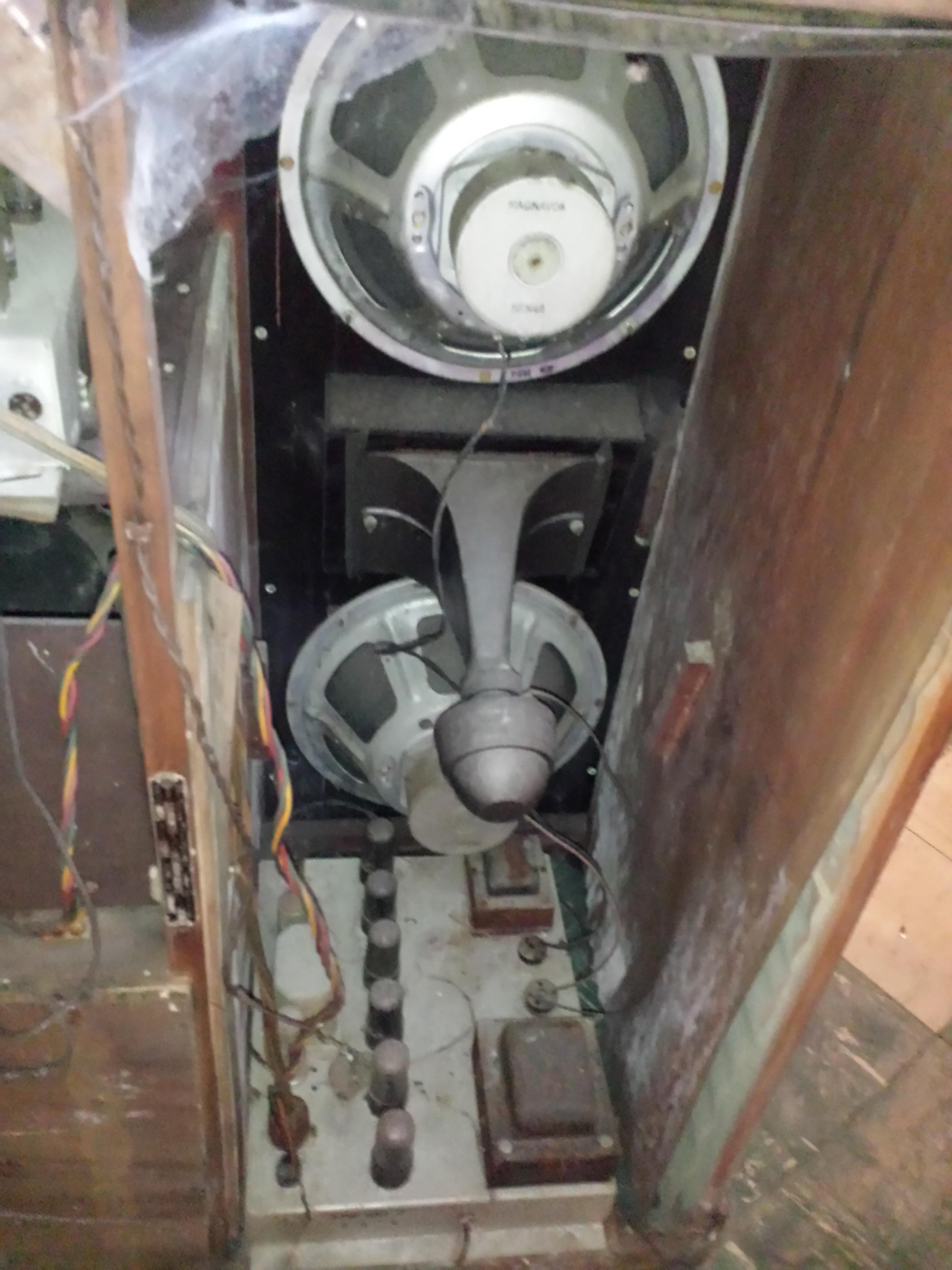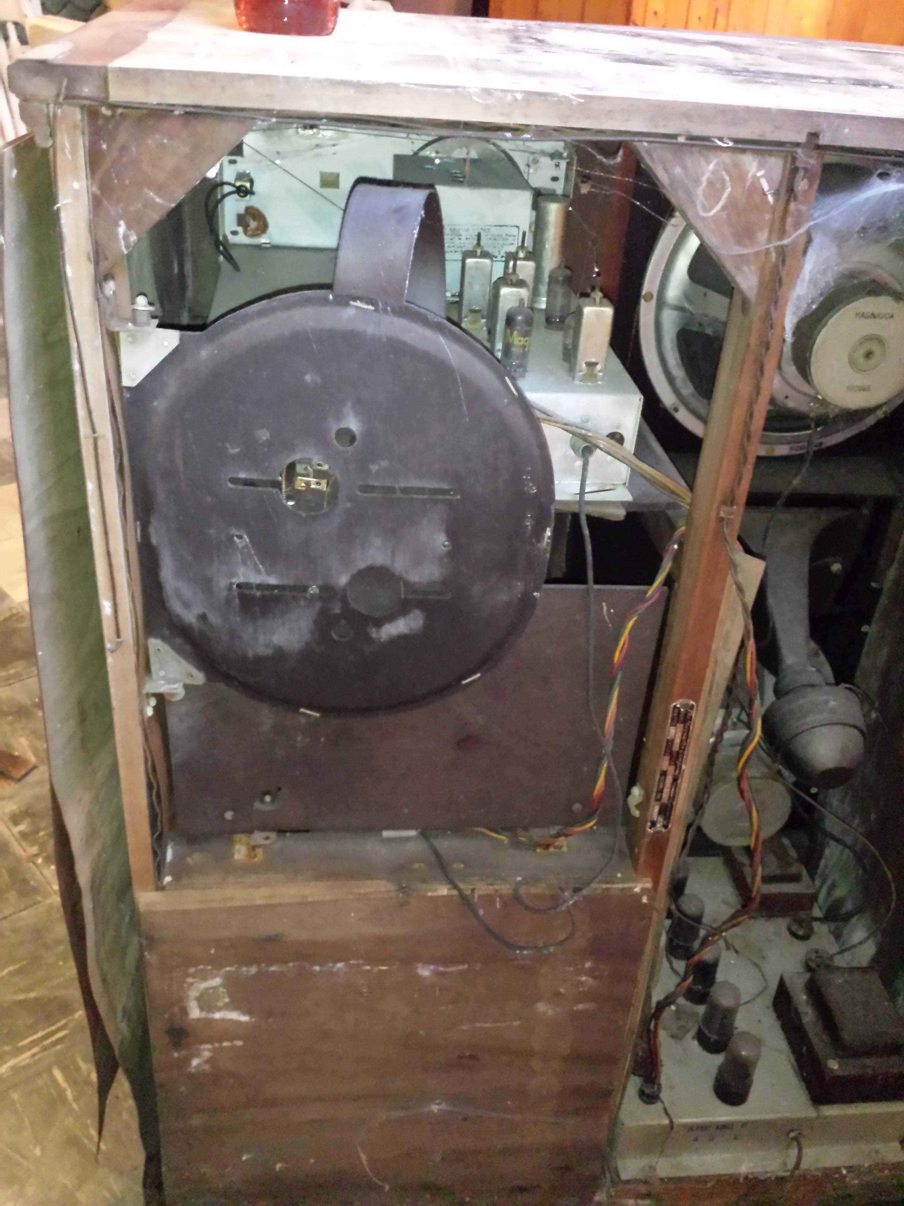 Magnavox radio phonograph model 253M, style C184-27, serial number 595987. Front of cabinet and radio is in great condition. Powers up. Top and sides of cabinet are badly damaged.