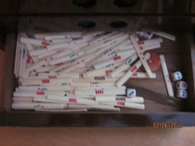 This mah jongg set is complete. The front panel slides up easily and there are 5 drawers inside. The antique store owner said that it had belonged to her husband's mother. Brought back from China by her husband who was in the military and served there. She said that his mother played mah jongg regularly with friends in Queens, N.Y. We purchased it in N.E. PA.