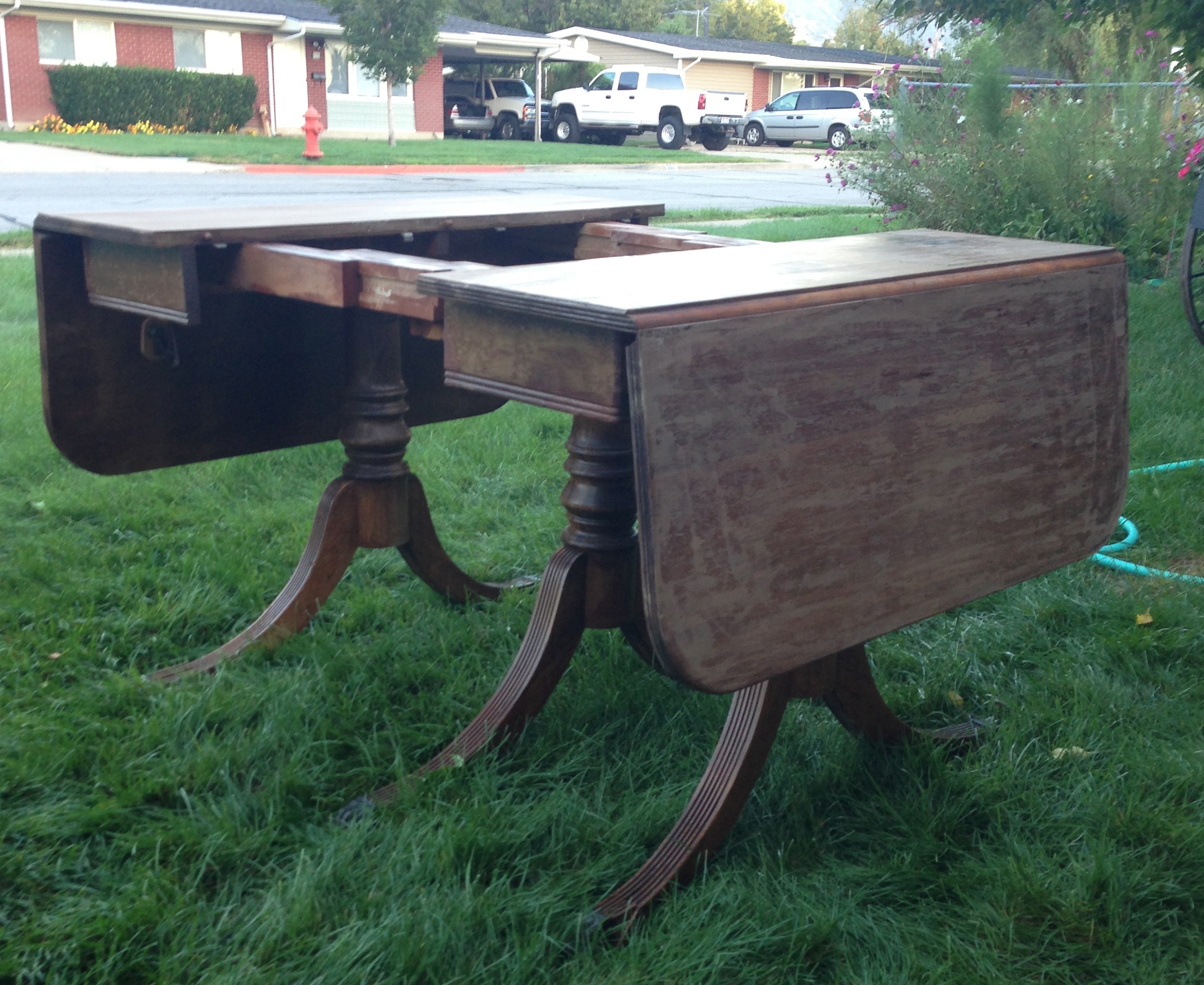 I purchased a drop leaf mahogany table at a yard sale this week. I am currently in the process of refinishing the top as the previous finish was chipping off from being in the sun too long and it had some water damage. The photos show the table right after having the old finish stripped so it doesn't look like it is in great condition but it really is.This table is about two feet long with the drop leaf portions being down, with them up it is approximately 4 1/2 feet long. I don't have any other dimensions on the table at this time. The table stands on three legs with claw feet. There is a wire mechanism that when pulled makes it possible to pull the table apart to add a leaf to the middle. The leaf wasn't available for purchase with the table. The table slide has the marking "Walter & Company, Wabash, Indiana, Table Slides". From the research I was able to do on this company it seems that they only constructed the table slides and not the entire table. The table has been marked "102" in several spots on the underneath side of the table top. There are no other marks to determine who the maker of this table is and I would really like to know so I can start looking for the middle leaf.