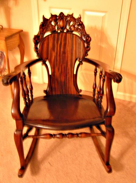 Mahogany rocking chair, original finish, carved, roaring griffons, tiger stripes on back only.