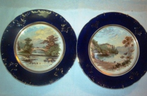 The front of the plates have writing on them: Boathouse at Loch Katrine and Bridge of Turk. Royal blue with gold gild on the outside of the plates.