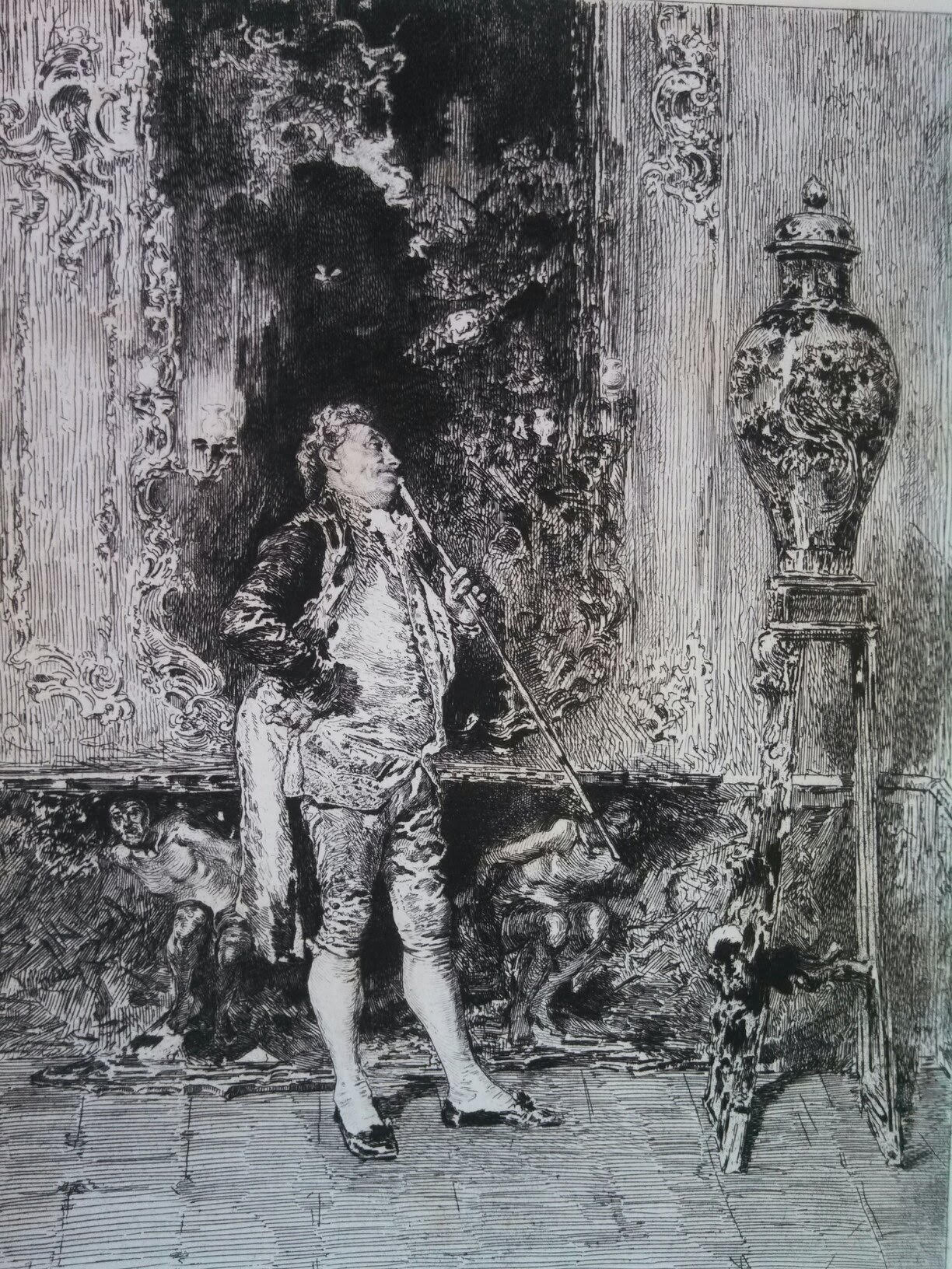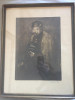 Vintage Etching of man admiring vase. No frame, on heavy cardstock type paper. Signed by artisit ( Looks like Meissonnier)but hard to read and dated 1870. The matting around print is stained.