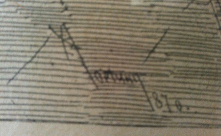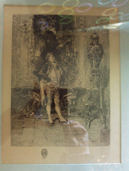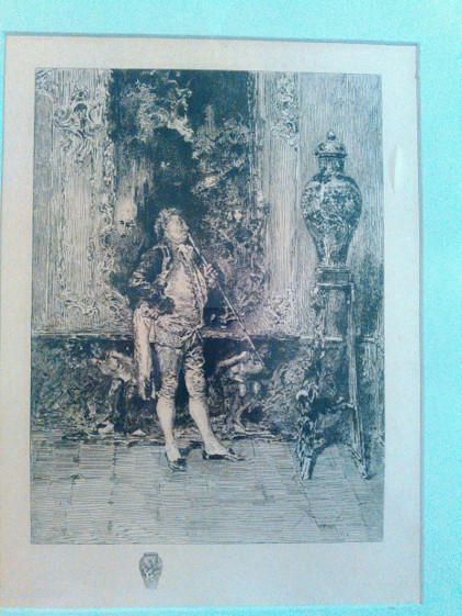 Vintage Etching of Man admiring vase. With frame, painted Matting, on heavy cardstock (?) paper. Signed by artist, dated 1870.