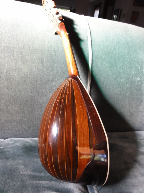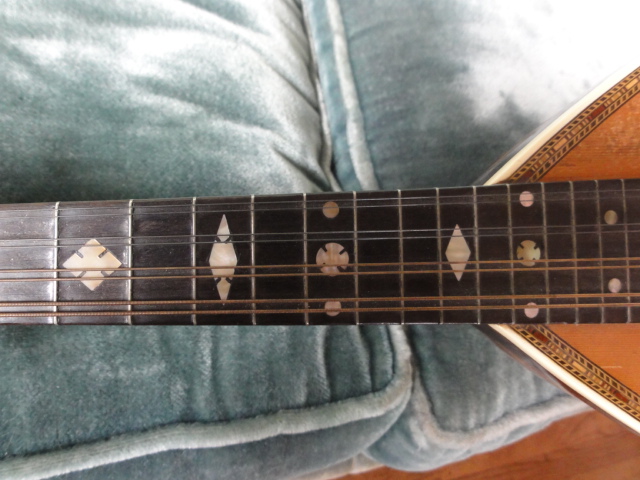 Classical mandolin. Has mother-of-pearl inlay in the neck. It shows some wear on the soundboard, but otherwise is in very good condition.