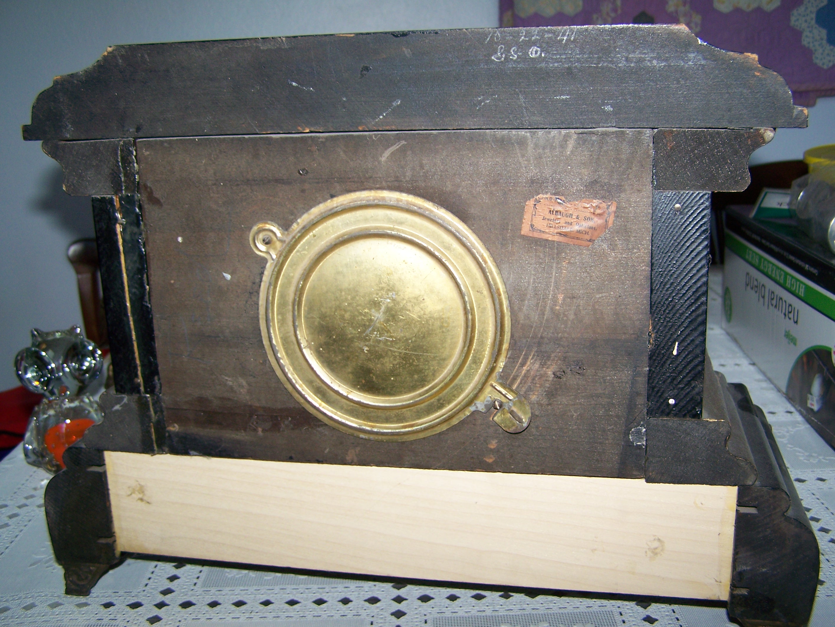 This is a mantle clock that has been in my wifes family for years. I cannot find a mfg. name on the outside of it and I didn't want to take the works out. The works are all brass, the clock worked when we last used it. There is one small board on the rear back bottom that had been replaced.