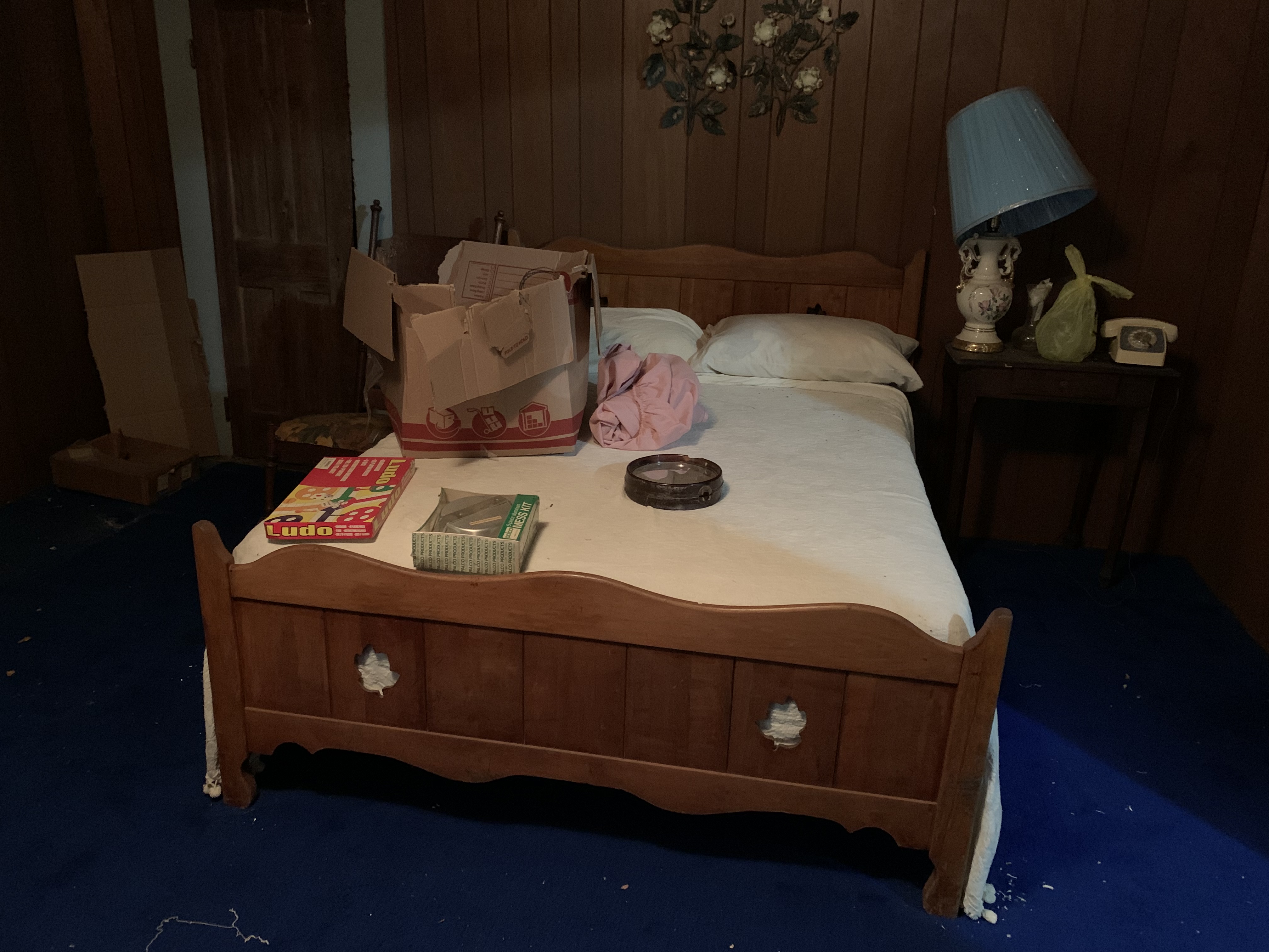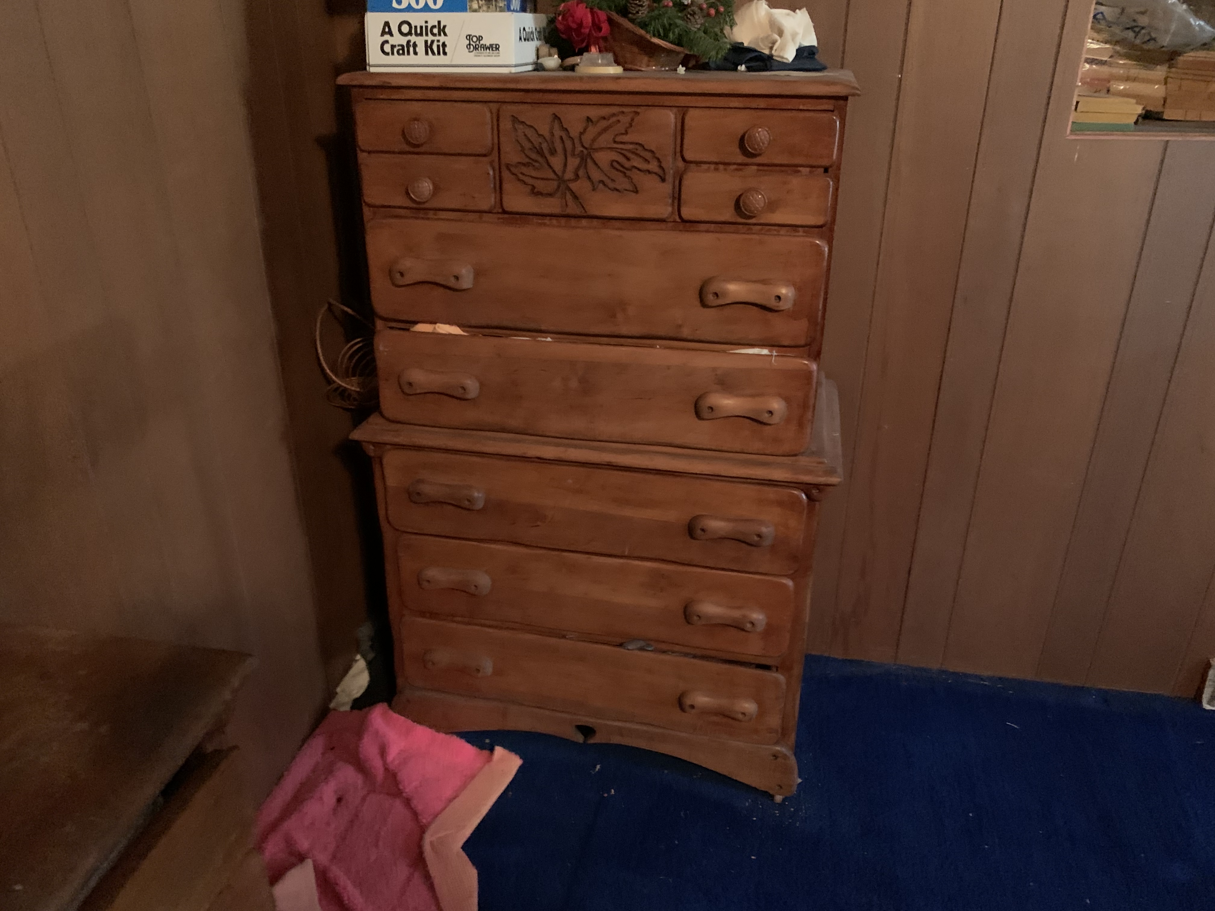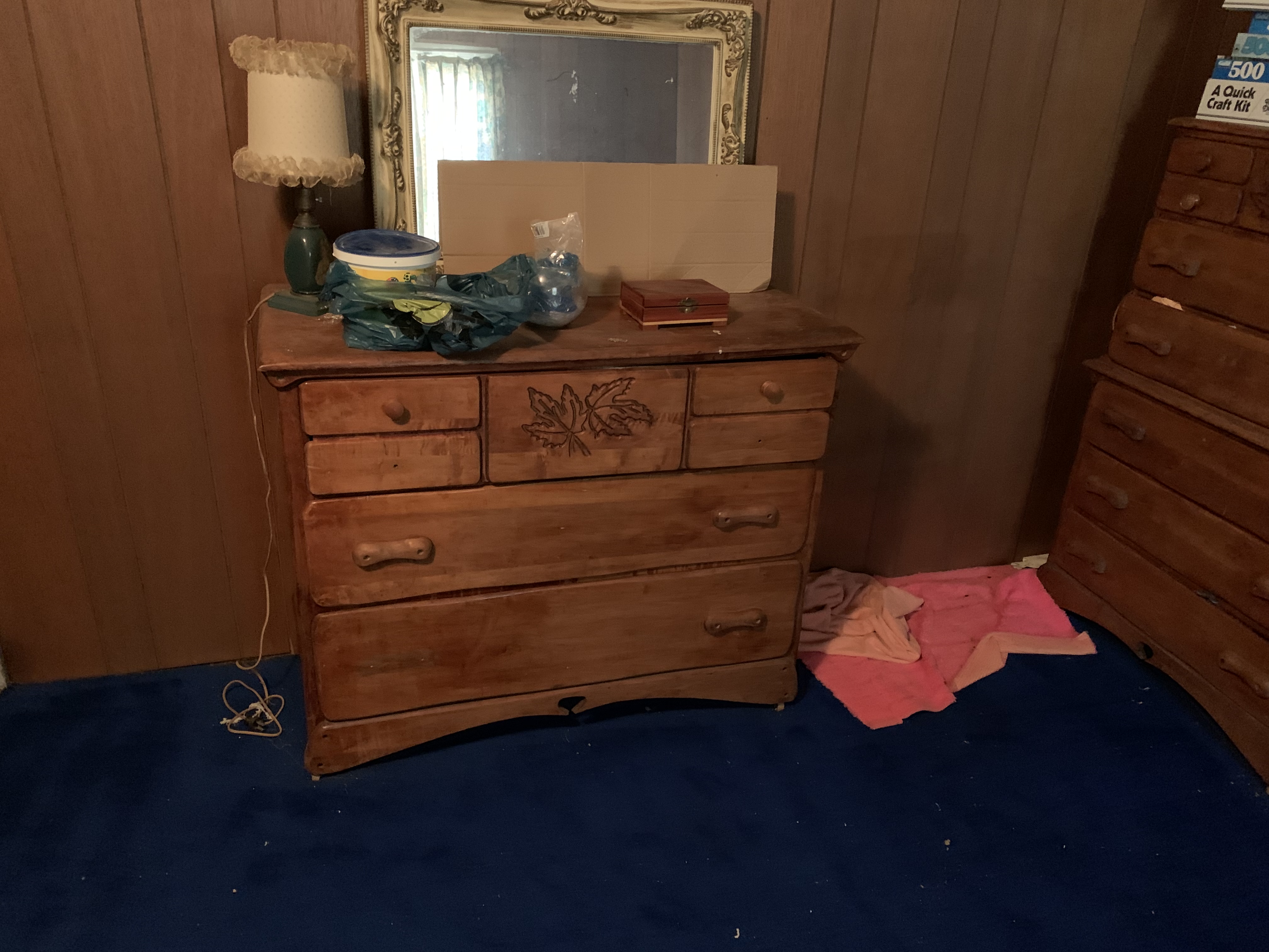 Bed, dresser and chest of drawers with leaves design on them