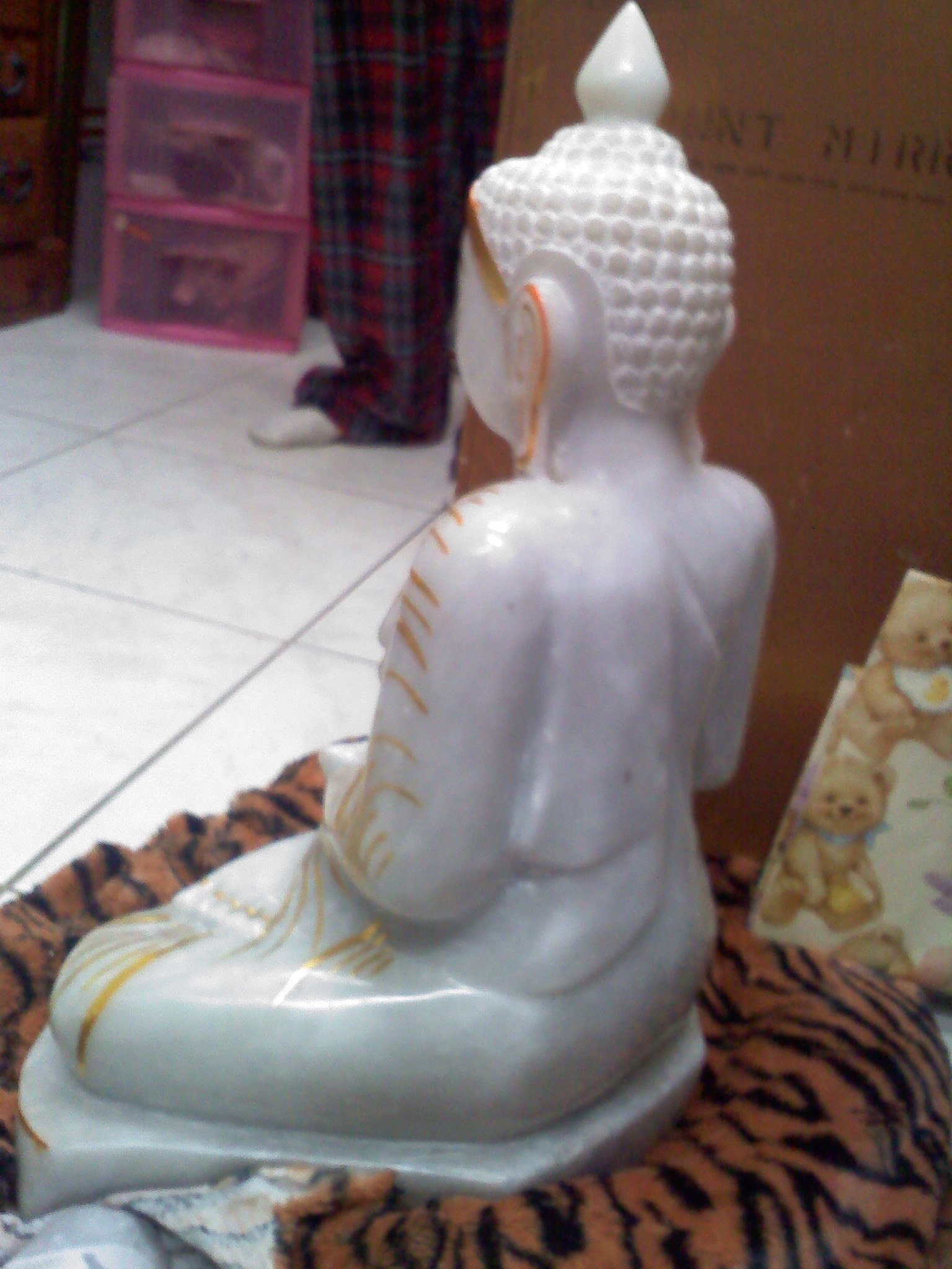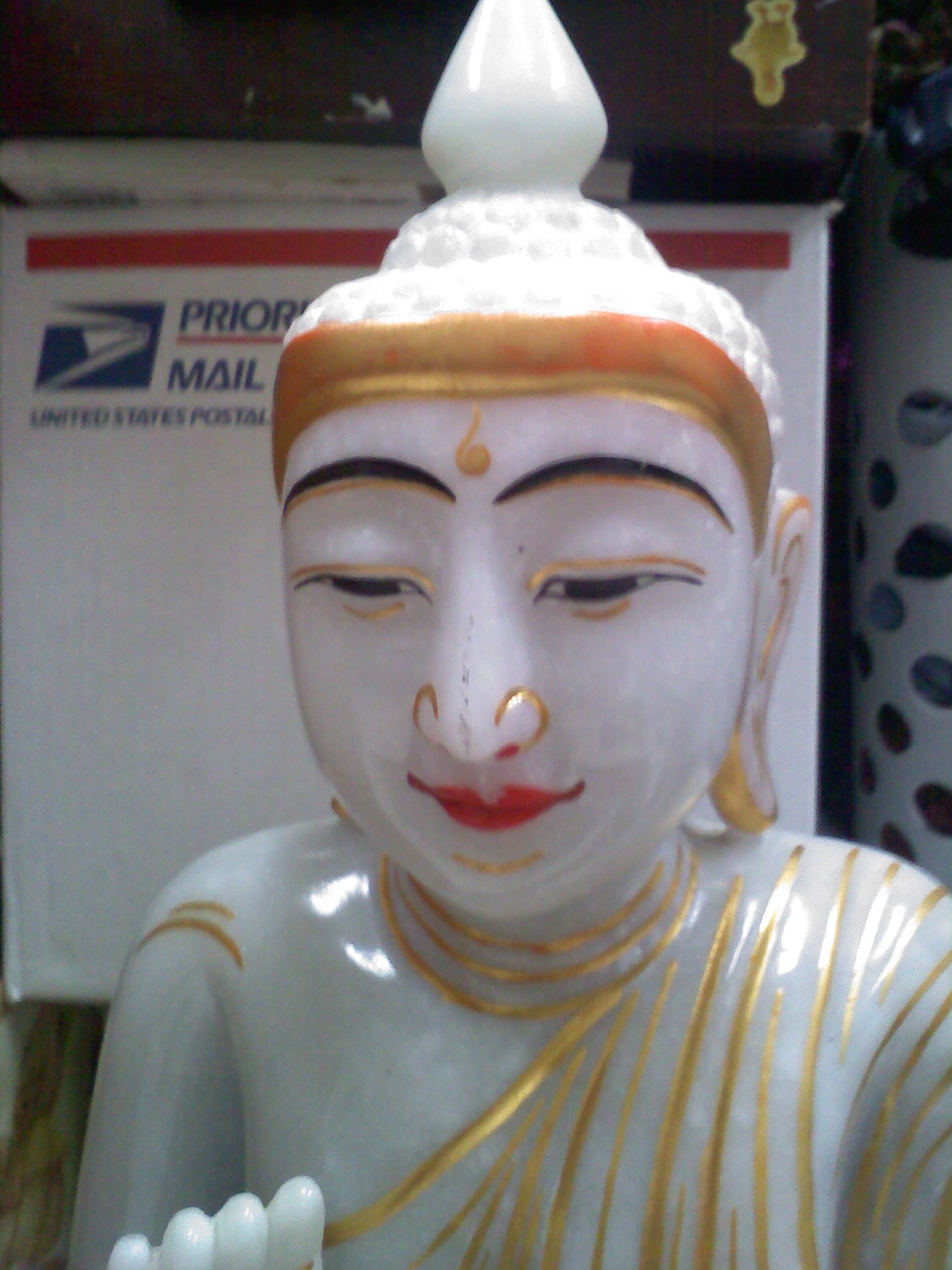 This is a White Marble Buddash Statue that is 22 inches tall and weighs about 200 pounds. she/he looks to be laced in Gold and from the closest we could tell we think the name is Amoghasiddi. We are trying to get a value or any info we can and hopefully find a buyer.