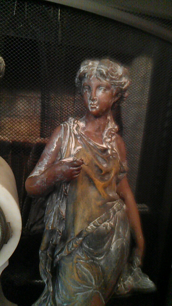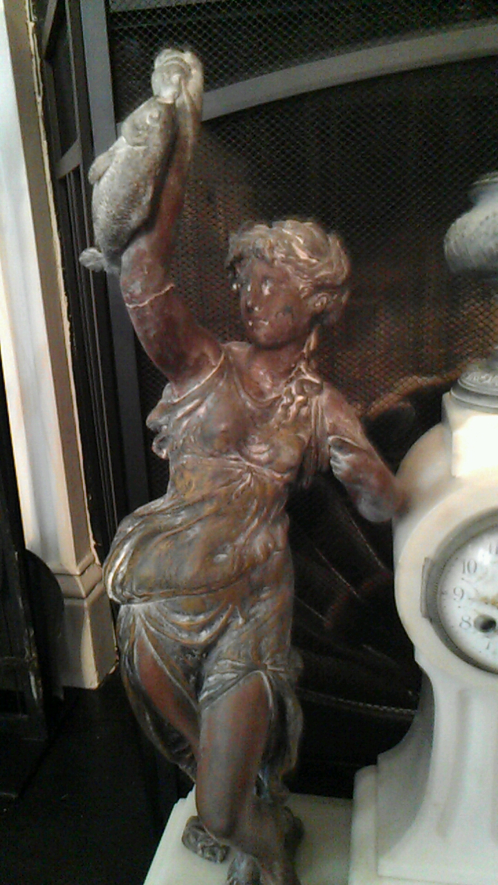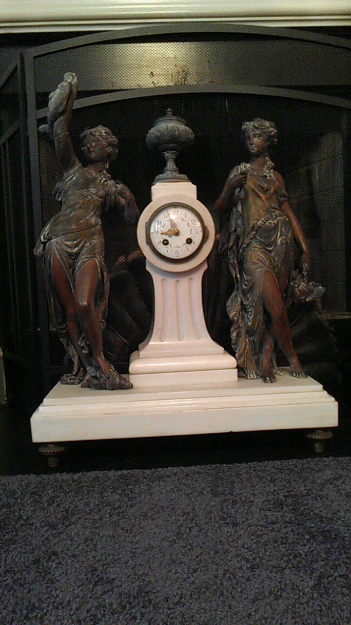 My father recently received a clock from his mother's house, which she had possessed since the 70's. The base is made of pure white marble and the two statues are made of an unidentified metal and have developed a yellow and clay-colored patina. The statues are of women which appear to be wearing tunics or togas, one holding a fish and the other holding a bird and a bow. The statue holding the fish has a hand which looks like it was, at one point, holding a spear or a trident, which has since been lost or removed.