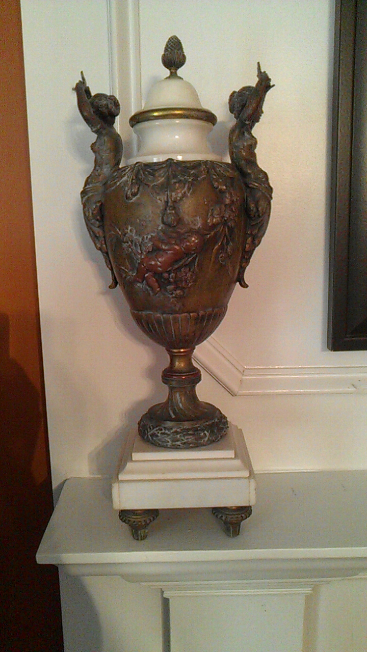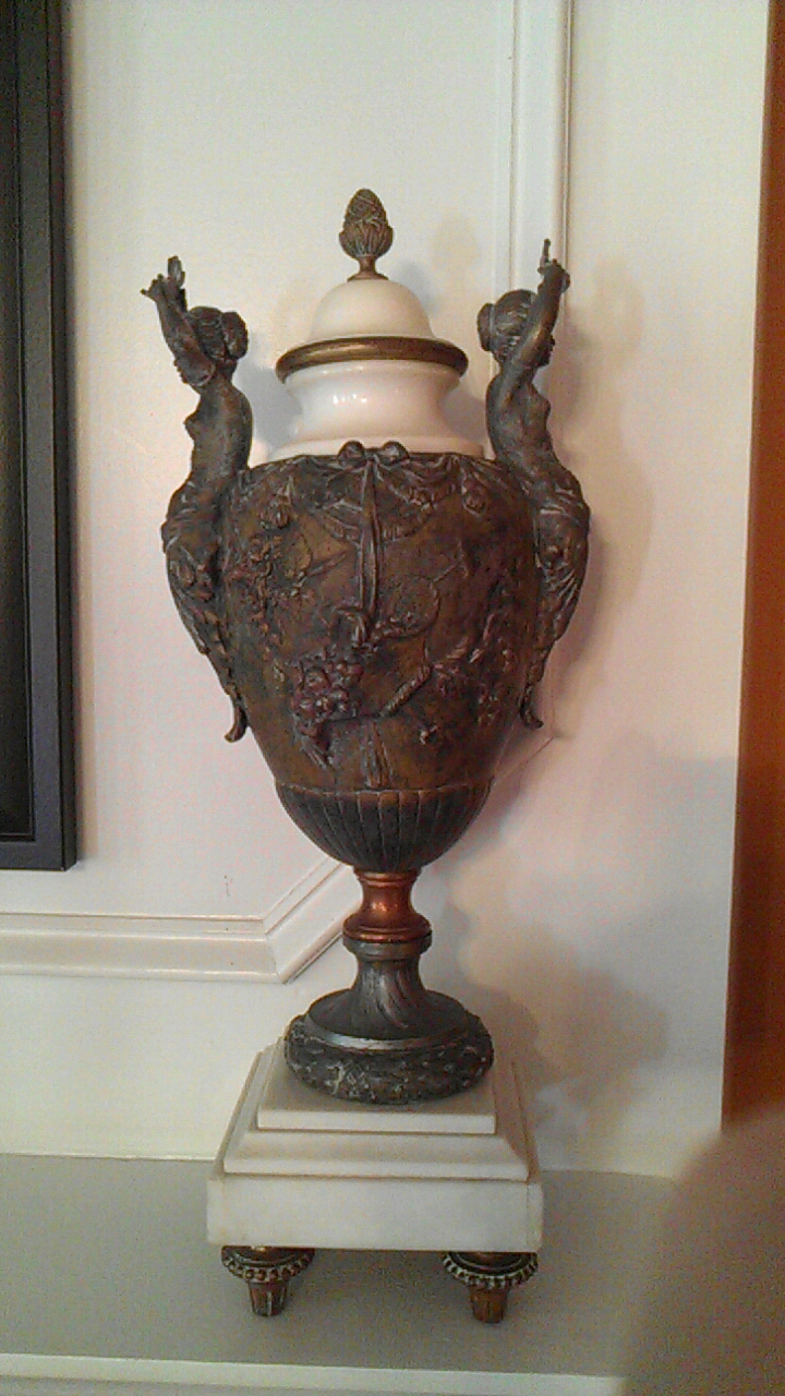 Entire set came with a pair of vases, same art design, appears to be same metal, also on white marble bases.