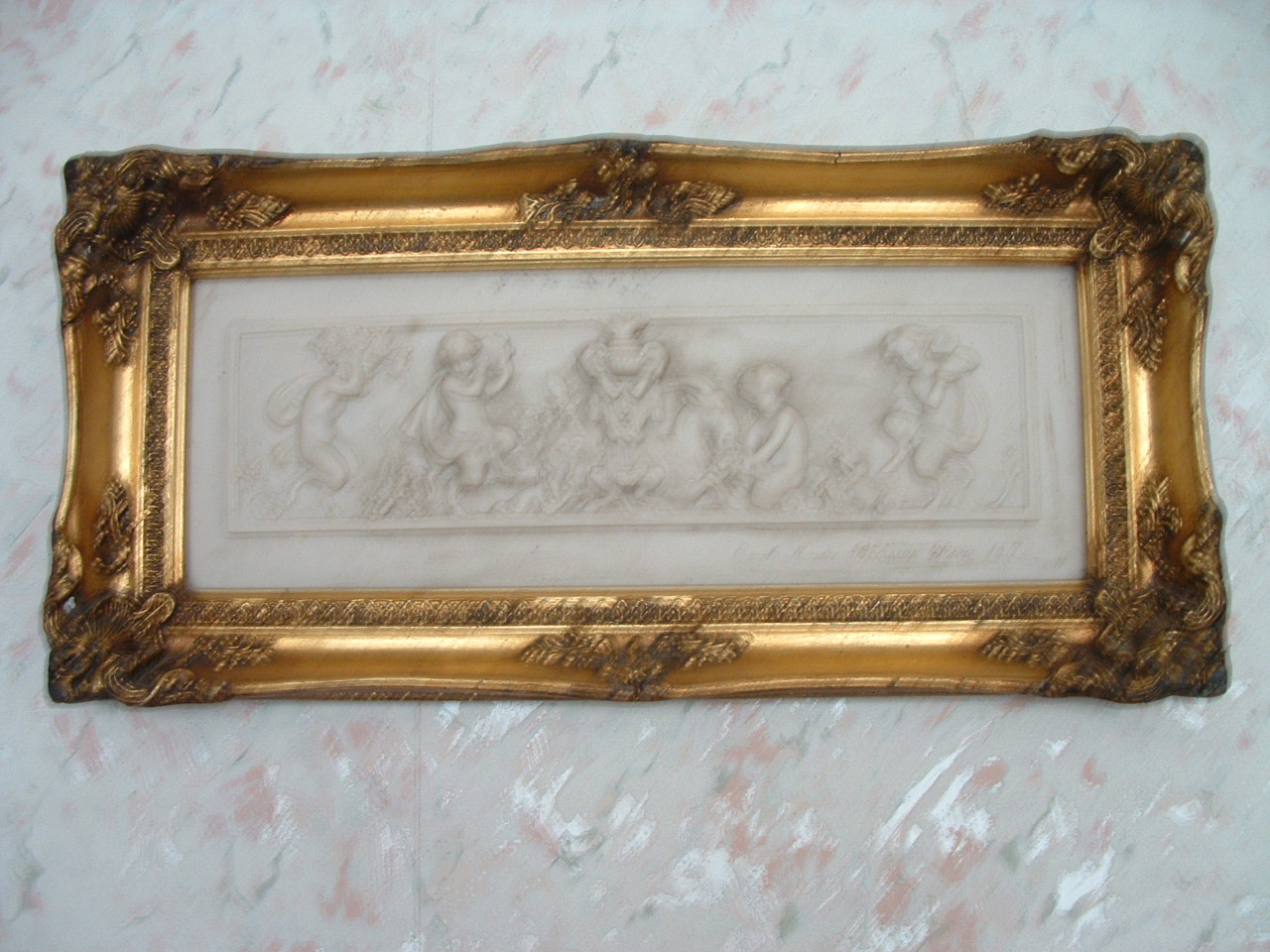 framed marble slab depicting a bacchanalian scene. is signed or engraved bottom right corner as follows
