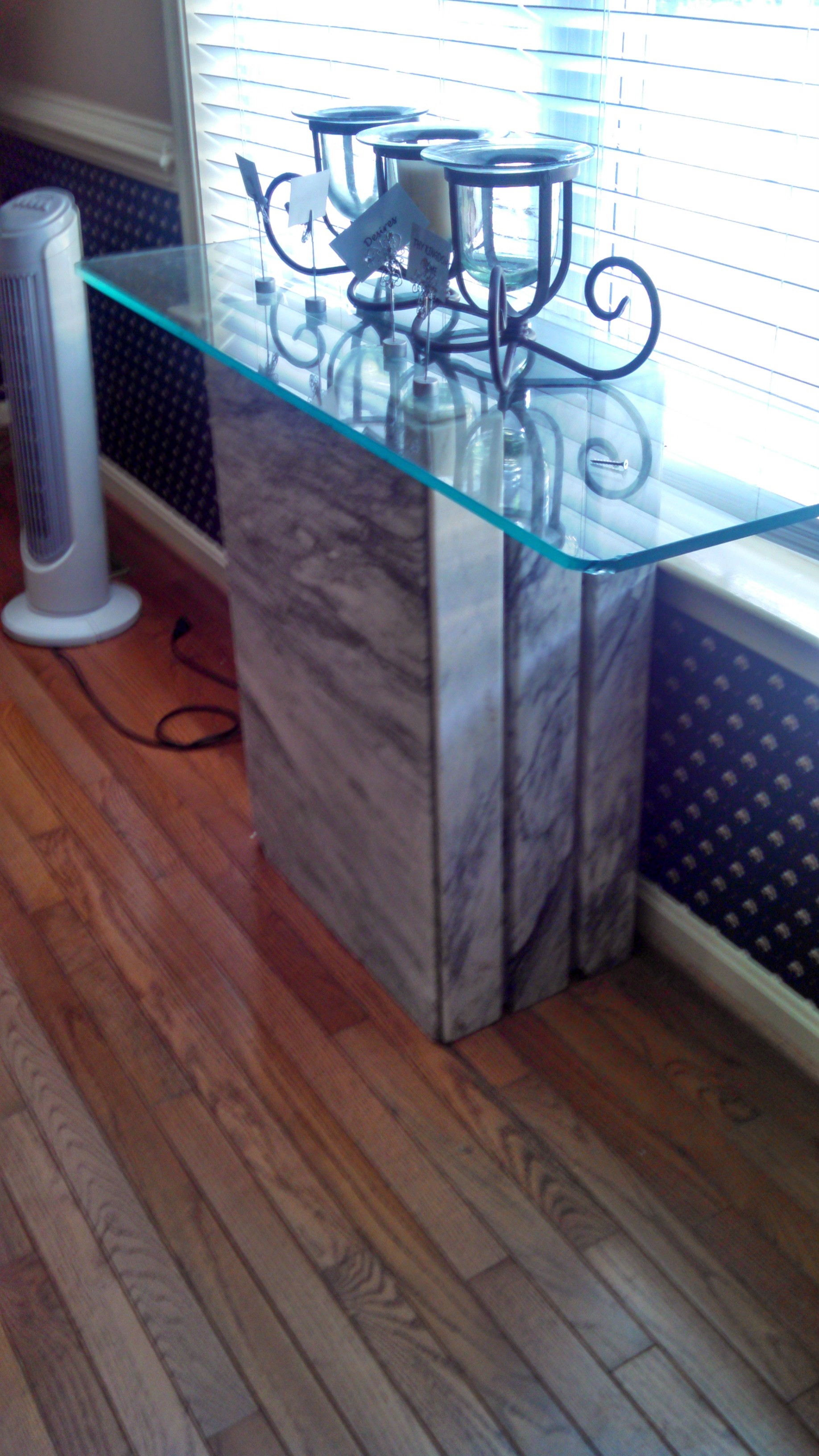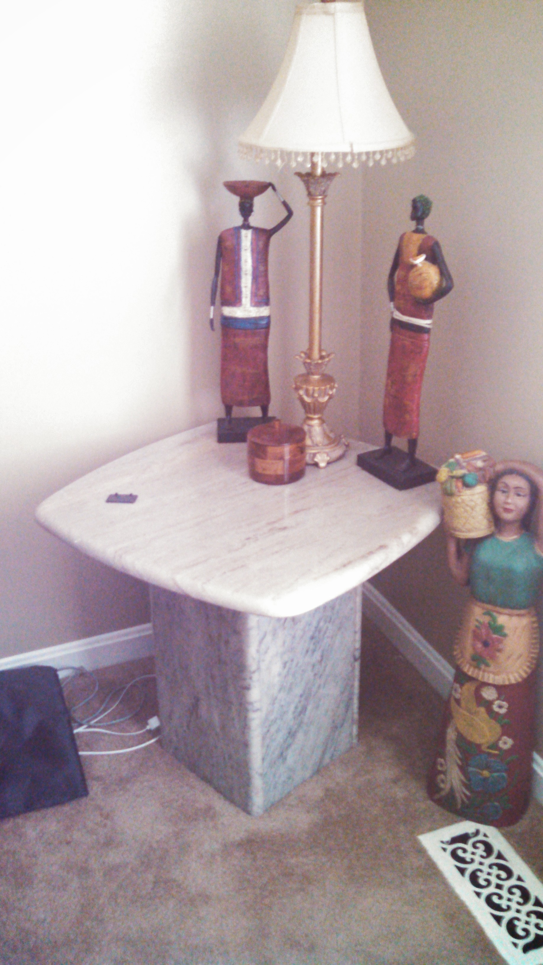I want to sell these items but want to be fair in pricing. Each end tableis two pieces of solid marble (top and base). The larger piece of marble has a chip on the backside about 3 inches but otherwise is solid as well. Not pictured is 2 end corners that make a glass sofa table. Each piece is solid marble.