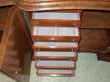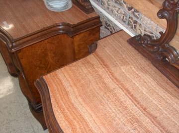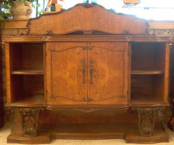 This is a beautiful hand made wooden buffet and sideboard pair. Hardware appears to be original. Has wood grain type marble. Very sturdy built. Heavy piece of furniture. Wood ornaments were hand carved. There are a few minor nicks, hardly noticeable. In very good shape for it's age.