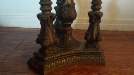 MARBLE TOP, WOOD UNDERLAY AND BRASS LEG WITH A 3 GLASS DECORATIVE