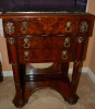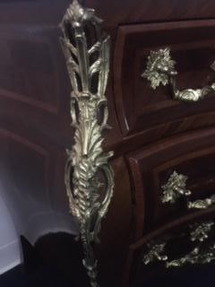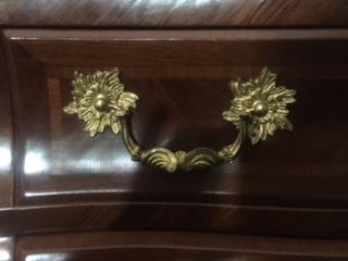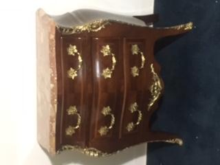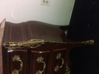 Inlaid wood details on front of drawers and side of commode. Brass pulls, edging and details on front feet. This peice of furniture was originally used as furniture in the display unit of a high end residential develpement. The marble top is not fixed to the commode and can be taken off to make it easier to move.