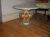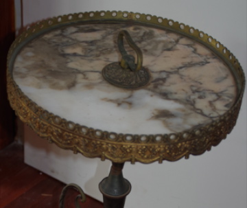 Ornate metal (brass?) tripod table with marble galleried circular top. 54cm high, top 33cm in circumference.Handle in the centre of the top.The piece weighs approximately 7kg. I bought it years ago because it looked so strange, and have always assumed that it's a copy - but of what?
